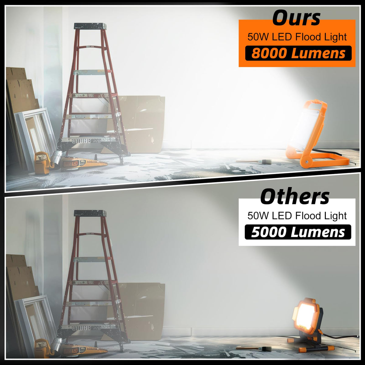 Q: What is the brightness level of the 50W LED work light?A: The 50W LED work light provides an impressive brightness of up to 8000 lumens, making it suitable for a variety of indoor and outdoor applications.