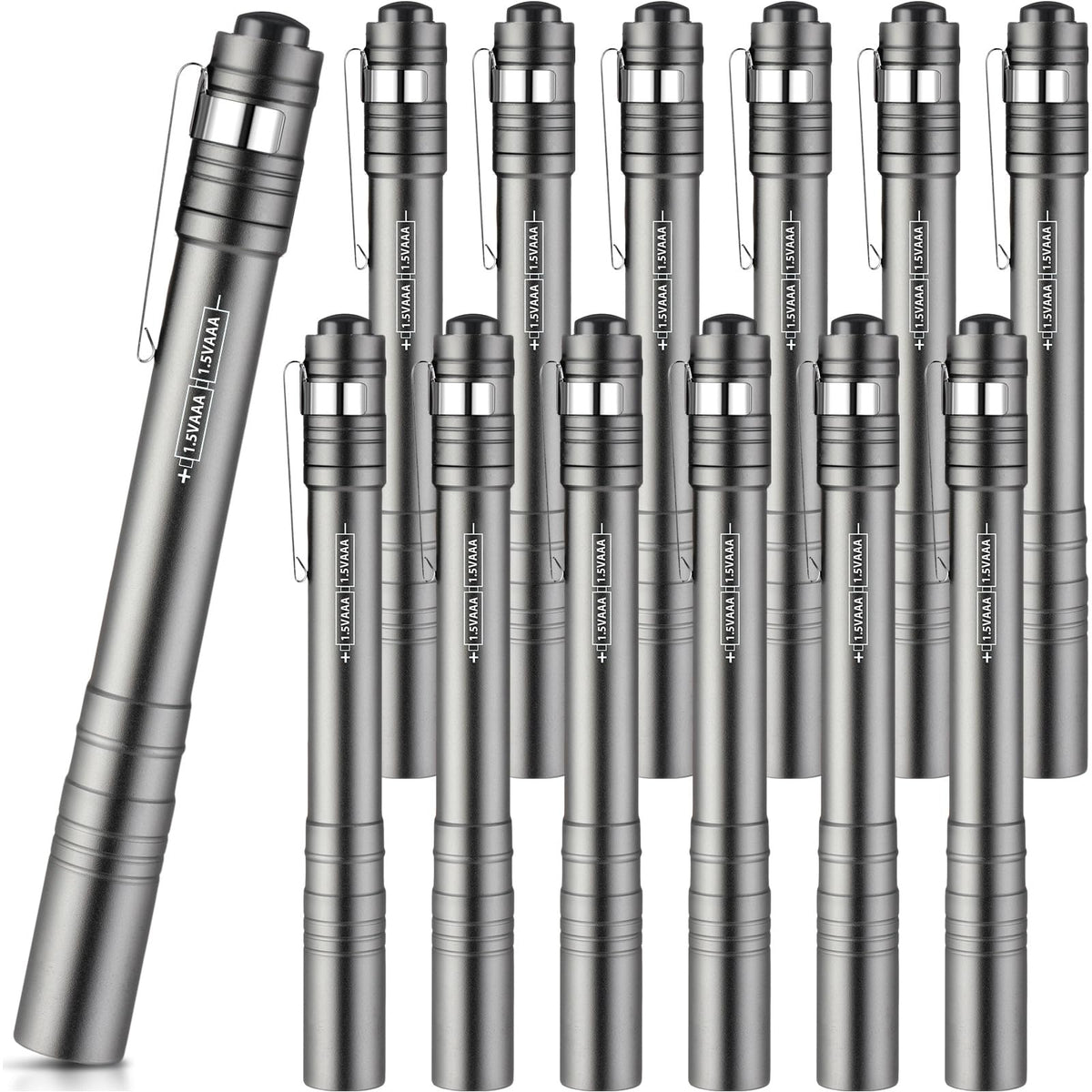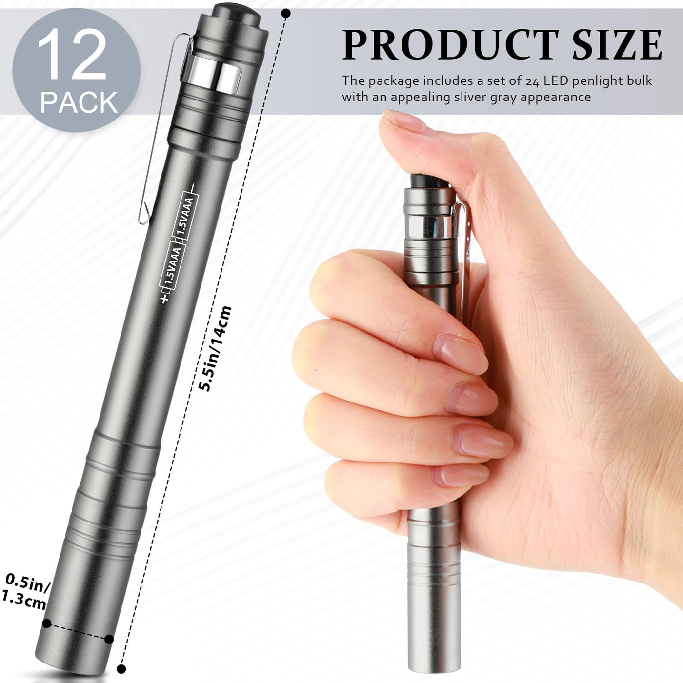 Features: Multipurpose functionality: Not only suitable for outdoor activities such as night walk, night reading, camping, or hiking, but the LED pocket pen light is also suitable for indoor uses. Thus, making it a practical add-on for every household. Exceptional portability: Each LED pen light is designed to prioritize user comfort. Its lightweight design fits effortlessly in your shirt, pocket, jeans, or pants. Easy to carry everywhere, it offers consistent convenience and a reliable source of light anytime, anywhere. Specifications: Material: aluminum alloy and LED bulb Color: silver gray Size: about 5.51 x 0.51 inches/ 14 x 1.3 cm Package includes: 12 x LED penlight bulk Notes: Manual measurement, please allow slight errors on size. The color may exist a slight difference due to different screen displays. Batteries are not included.