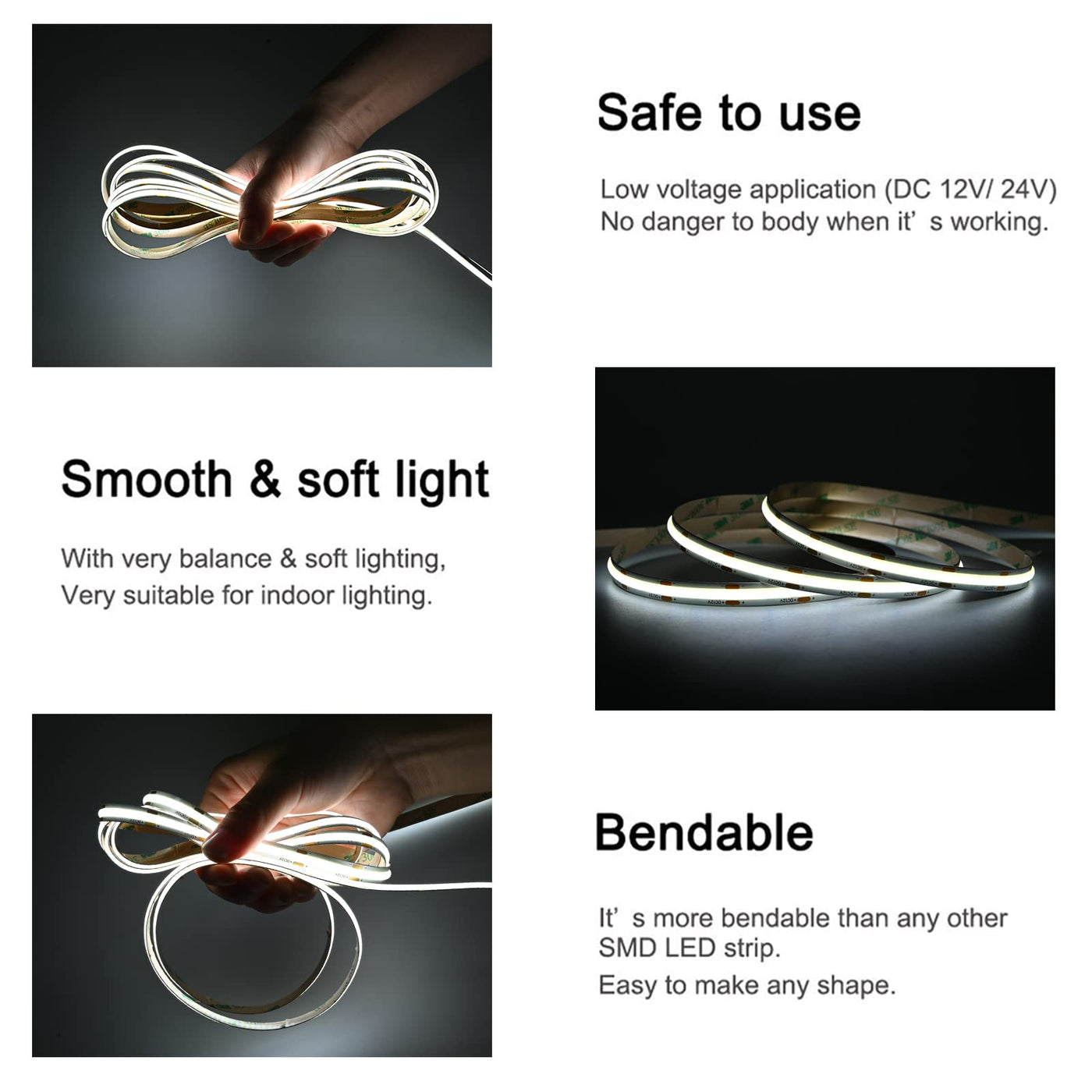 Q: What are some common applications for these LED strip lights?A: These flexible COB LED strip lights are perfect for home decor, providing bright illumination for living rooms, kitchens, or as TV backlights. They can also be used in commercial settings like shop windows, display cases, stair lighting, and workbenches.