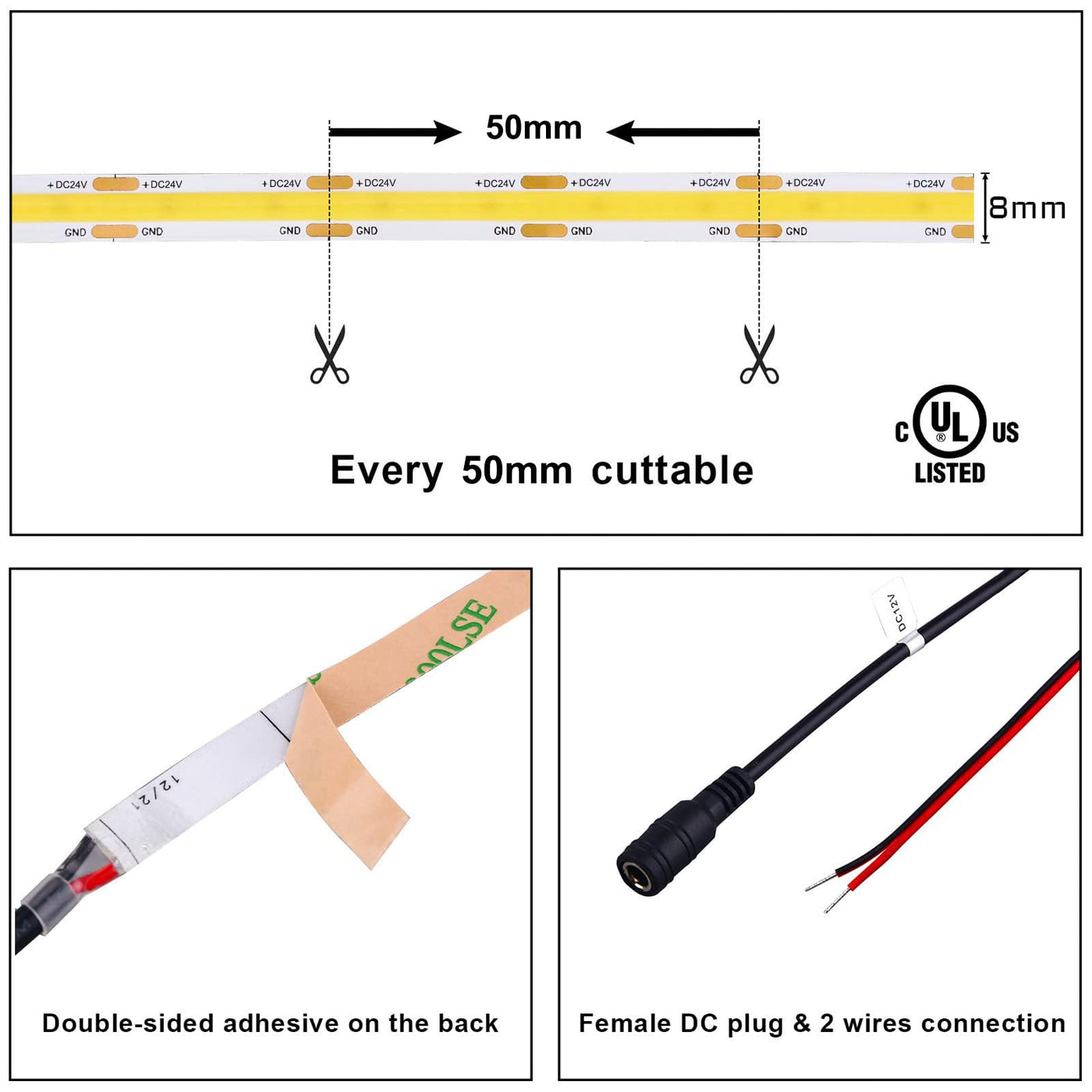 Q: Can I cut the COB LED strip to fit my space?A: Yes, the COB LED strip can be cut every 50mm along the black line, allowing for customization to fit your desired length and space requirements.