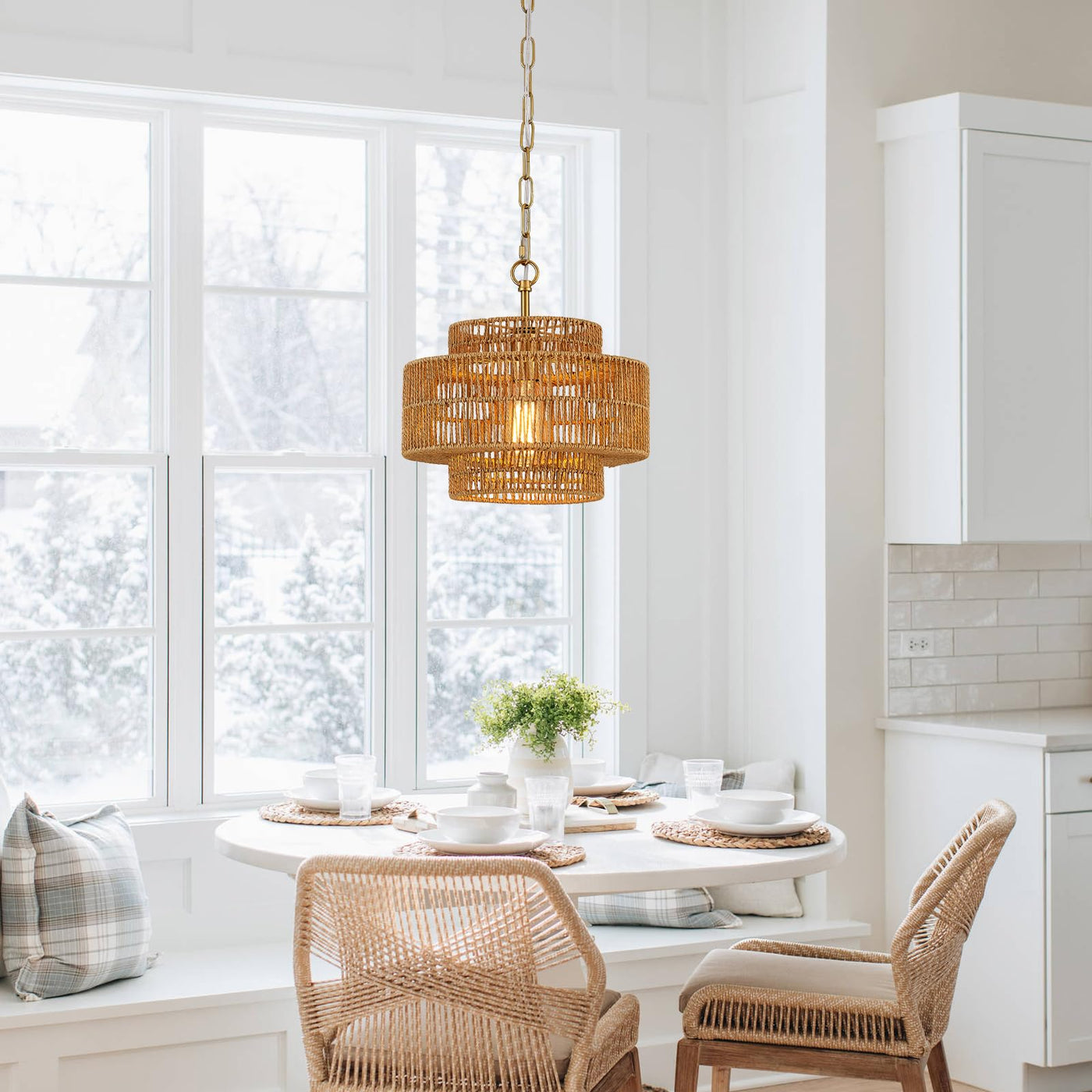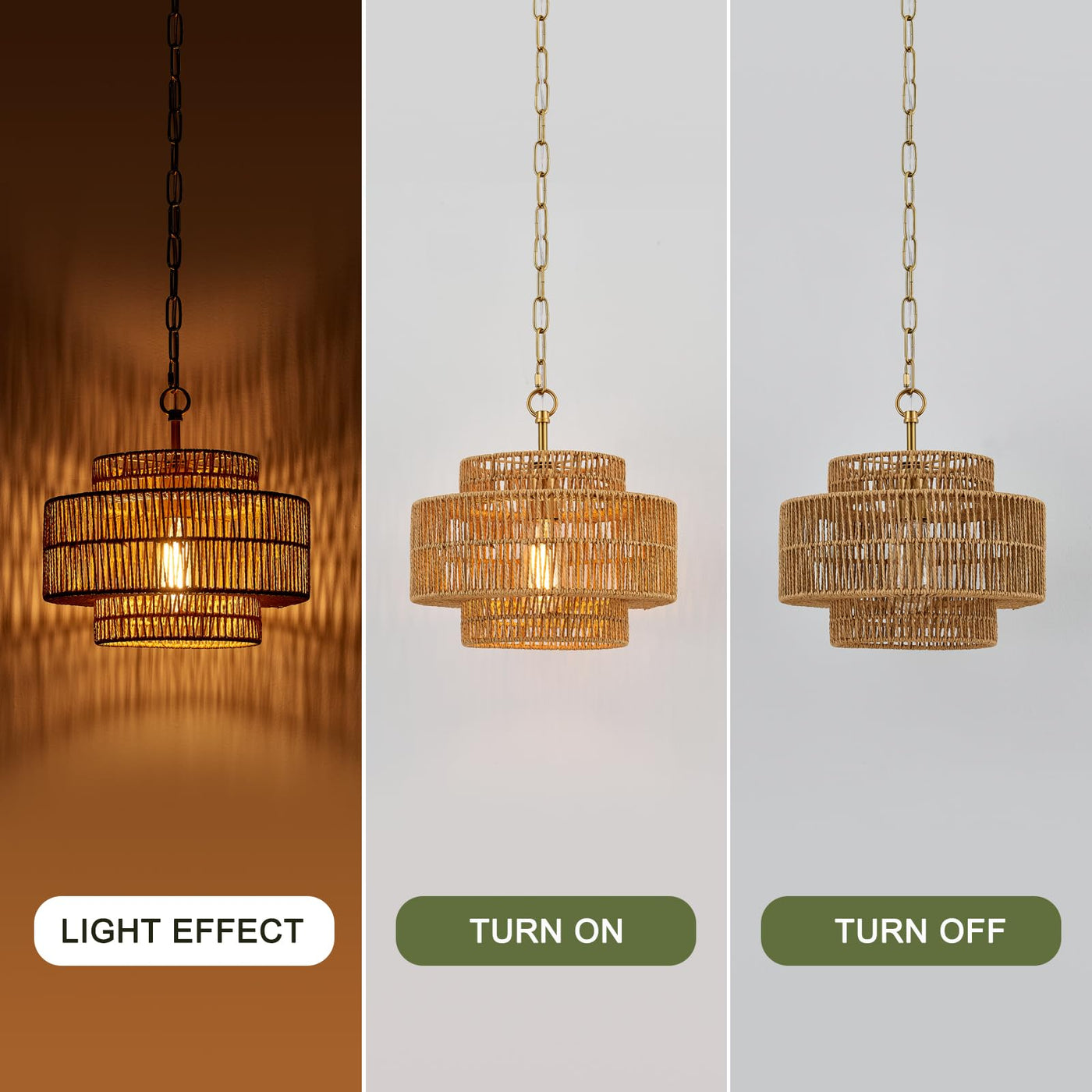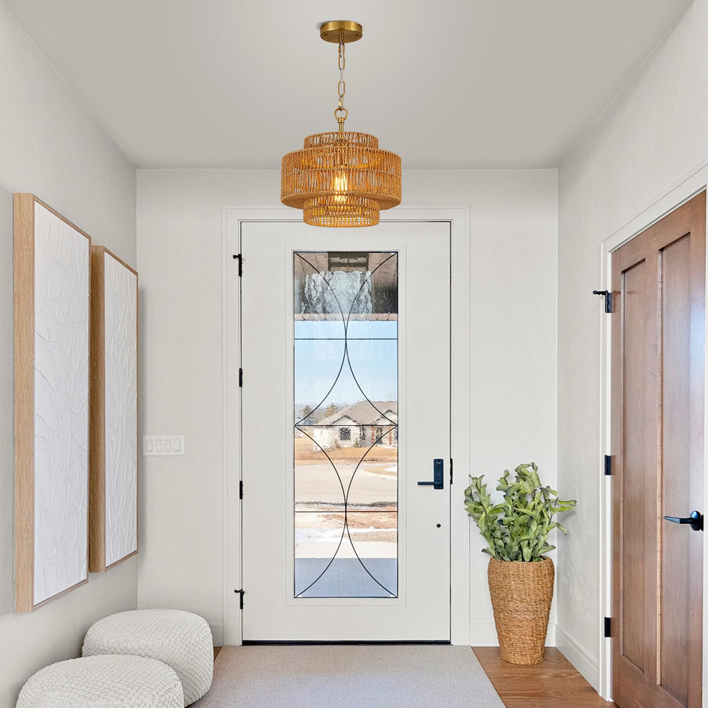 Tunkayli 12.6 Rattan Pendant Light Fixture Vintage Farmhouse Hand-Woven Boho Bamboo Pendant Lighting Mini Drum Wicker Golden Chandelier For Kitchen Island Bedroom Dining Room Entryway Foyer