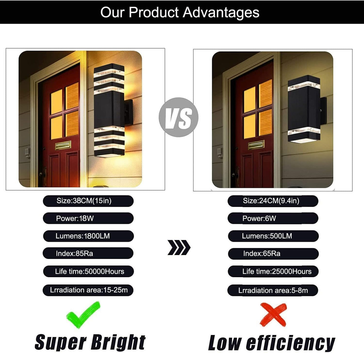 - **Energy Efficient**: Each LED wall light operates at 18W (1800LM), providing bright illumination while consuming 80% less electricity compared to traditional lighting options. Designed for longevity, these lights boast an average lifespan of 50,000 hours.