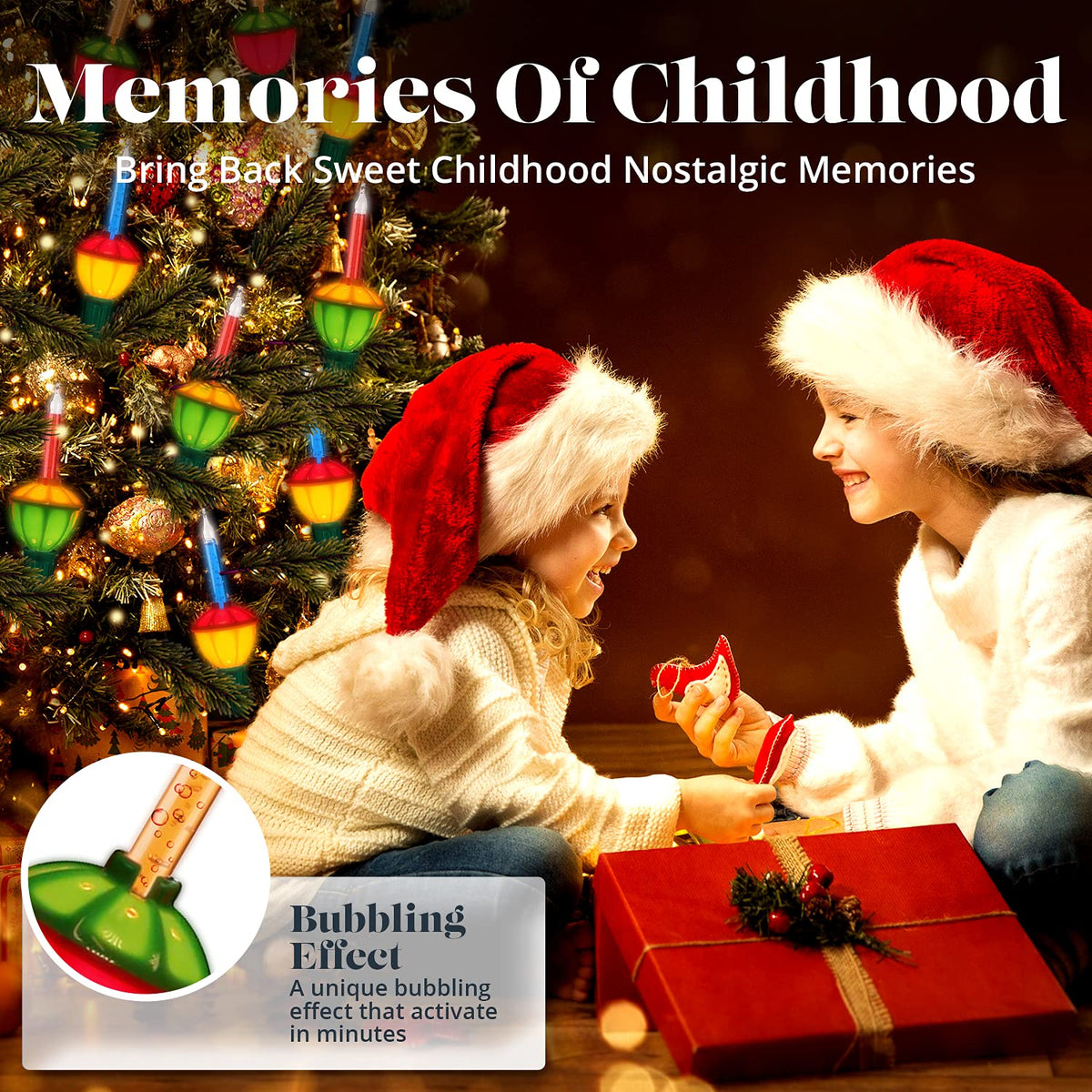 COLORFUL BUBBLE ACTION The warm light is created by the incandescent bulb generates the liquid within the tube to bubble cheerfully on your tree, like the old fashioned Christmas tree lights creating a cozy feeling and Christmas spirit, watching these lights bubble is heartwarming