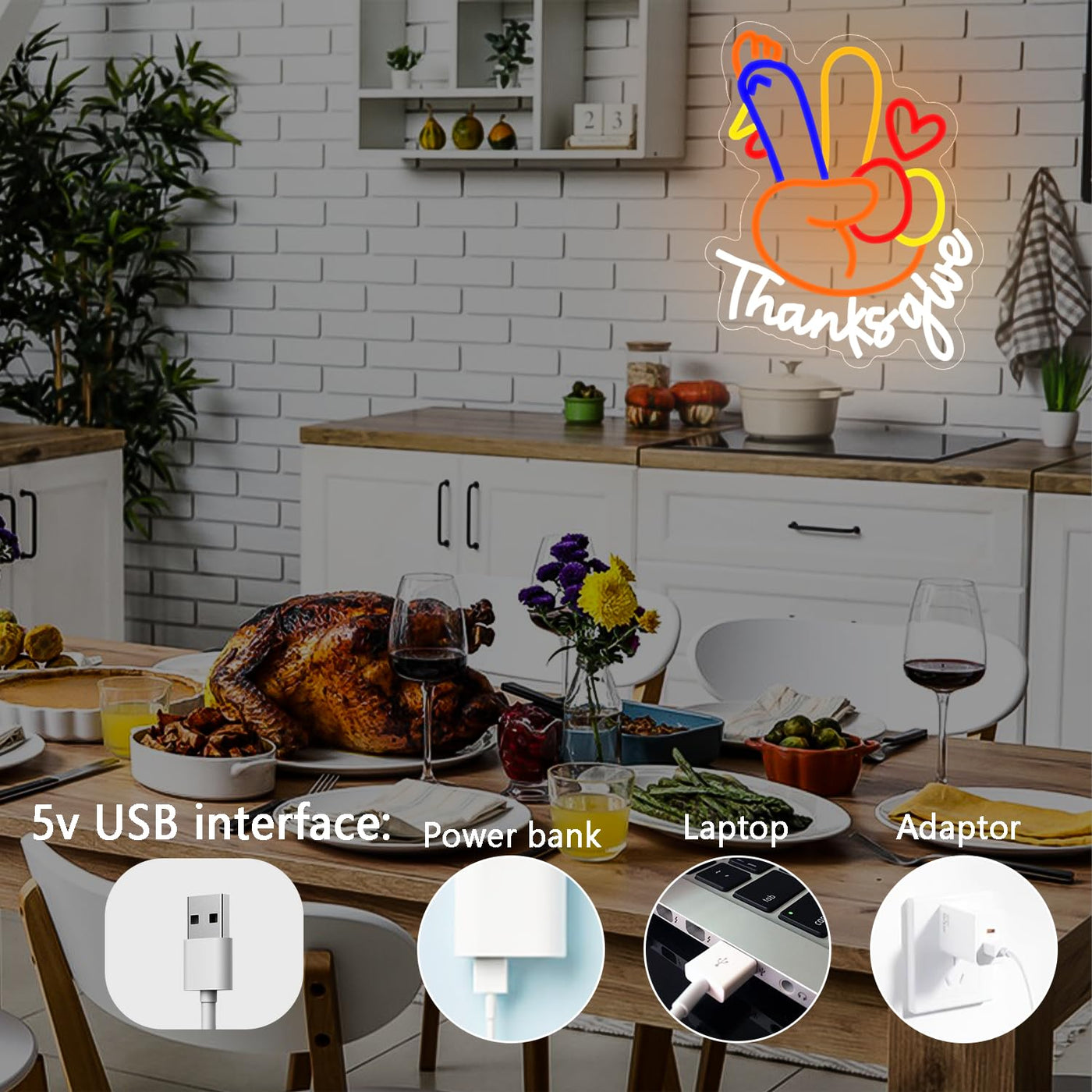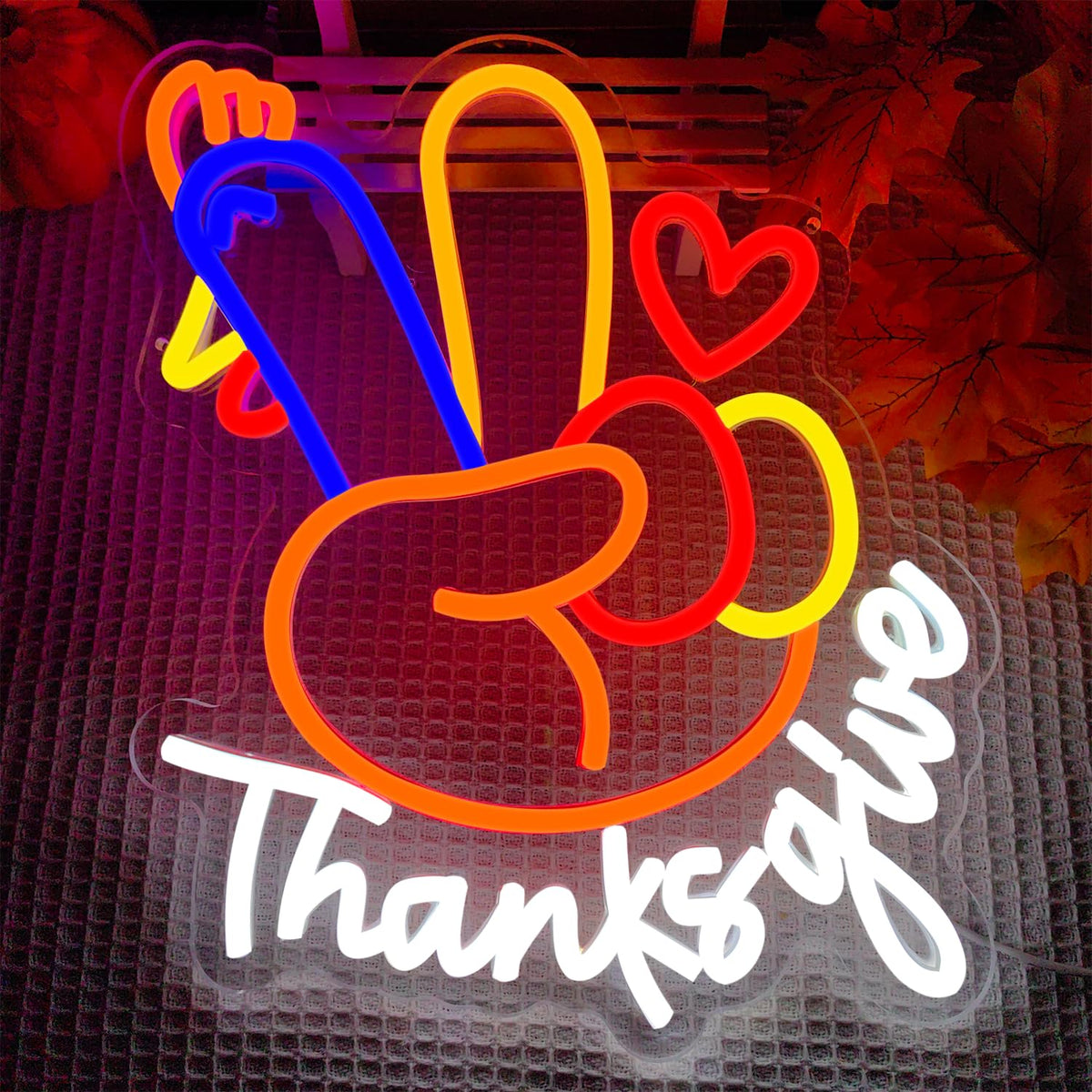 Fun Design: Happy Thanksgiving Neon Sign Features A Unique Image Of A Turkey Making A V Sign, And The Heart Detail At The Tail Adds A Warm Touch