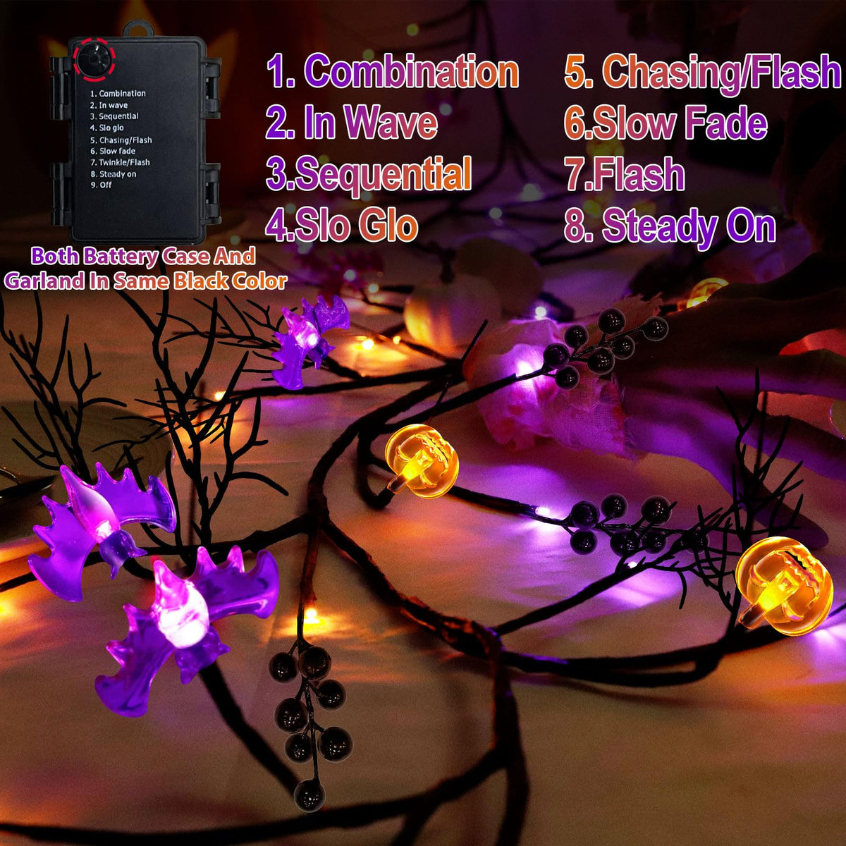 Specification:Size: 9 Ft (Long)Bat: 2*1.5 inch (height*width)Pumpkin: 1.2*1 inch (width*height)Packing box: 6.8*7*1.5 inch (length*width*height)Weight: 0.65 poundNumber of lights: 72 LEDProduct color: blackBranches: 24 large branches (72 small branches)Product appearance:Pumpkin style: 24 jack-o-lanterns pumpkin + 48 orange LED lightsBat style: 24 bat lights + 48 purple LED lightsPumpkin & Bat style: 12 bat lights + 12 jack-o-lanterns pumpkin + 24 purple LED lights + 24 orange LED lightsMaterial: PVC + electronic components.Lighting color:Pumpkin style: orangeBat style: purplePumpkin & Bat style: orange + purple8 Lighting modes: combination, in waves, sequential, slow glows, chasing/flash, slow fade, flash, and steady on.Power supply: 3AA battery (battery not included).Other Features: Waterproof, Timer (6 Hours On/18 Hours Off), 8 Modes.Applicable scenes: indoor, outdoor, Halloween decoration, wall, dining table, doorway, windowsill, mirror, fireplace, living room, bedroom.Package Includes:1 x Halloween Willow Vine