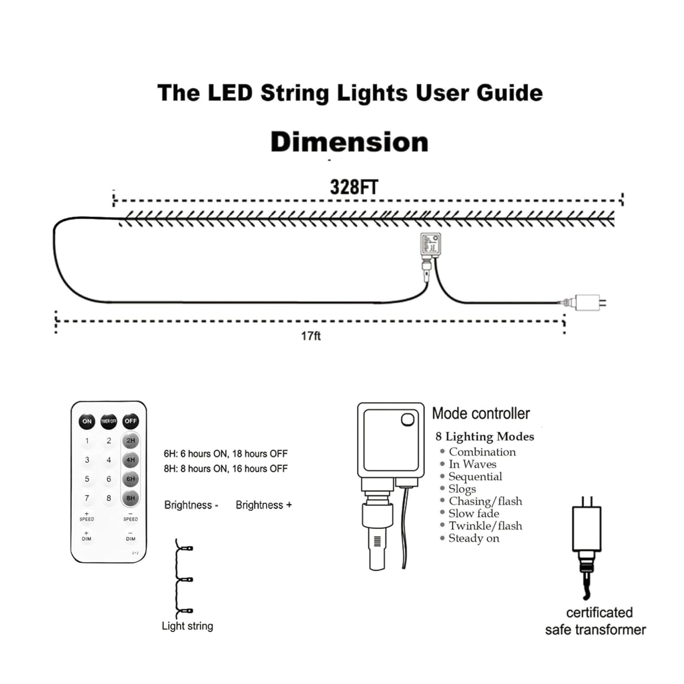 Q: How many lighting modes do the Christmas lights have and what are they?A: The Christmas lights come with 8 different lighting modes: combination, in waves, sequential, slo-glo, chasing/flash, slow fade, twinkle/flash, and steady on, allowing you to create the perfect atmosphere for any occasion.