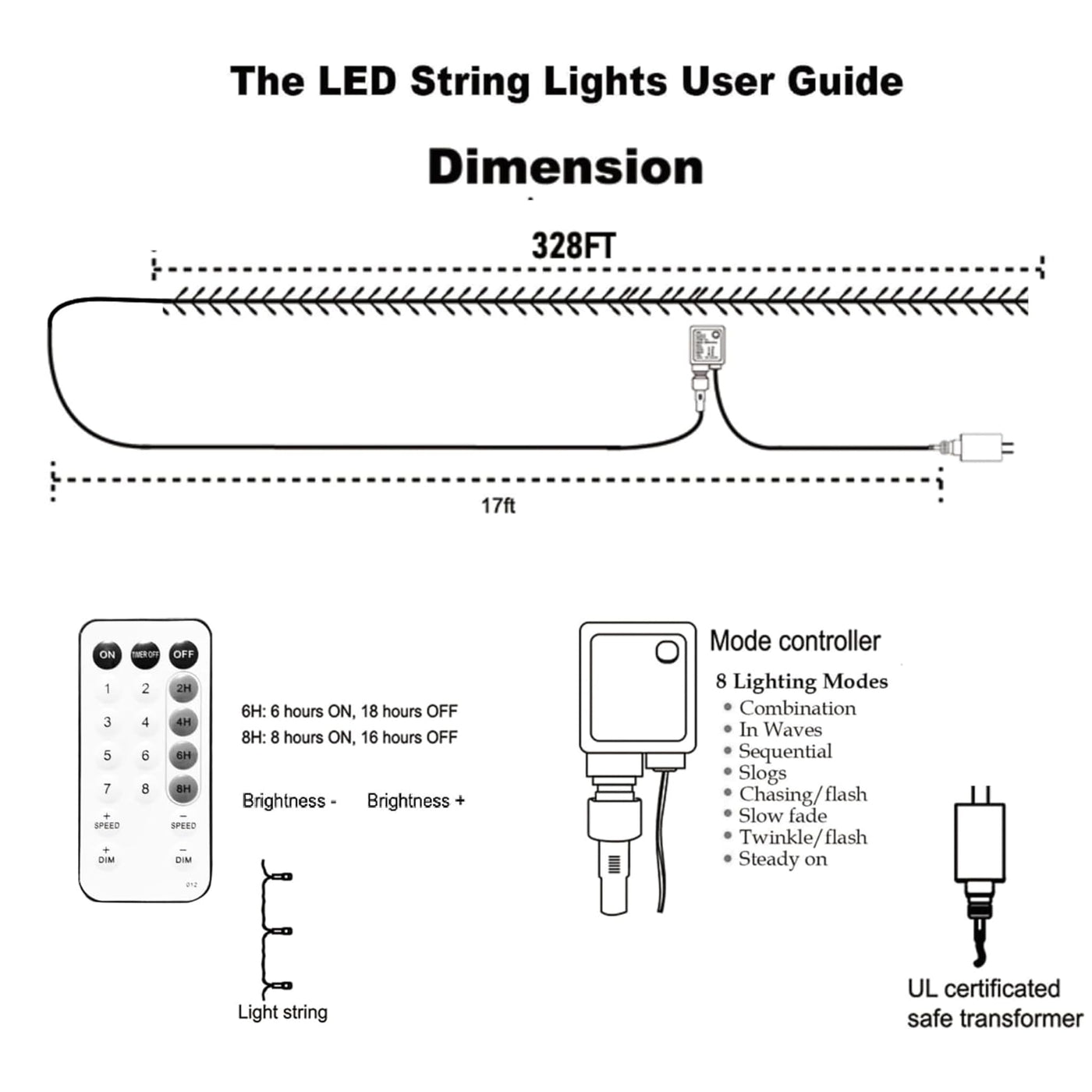 Q: What lighting modes are available with the remote control?A: The remote control offers 8 different lighting modes, including combination, in waves, sequential, slo-glo, chasing/flash, slow fade, twinkle/flash, and steady on. You can also adjust the brightness and set timer modes for convenience.