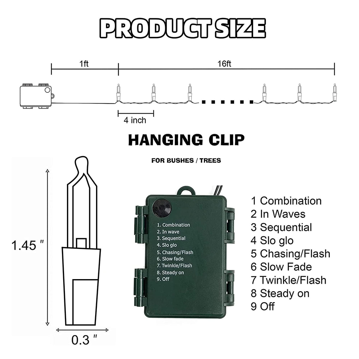 - **8 Unique Lighting Modes**: Choose from a variety of lighting effects to match your mood or event. With modes such as combination, slow glow, wave, sequential, chasing/flash, slow fade, twinkle/flash, and steady on, customizing your lighting experience is effortless. Simply press the button on the battery box to switch modes.