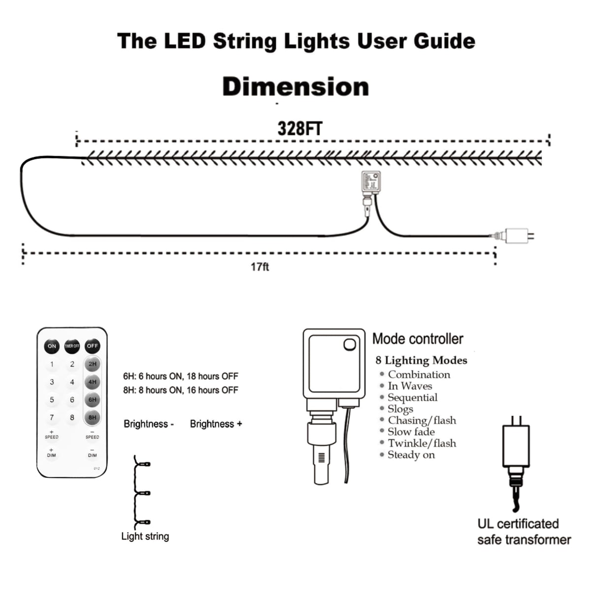 The TW SHINE Christmas lights feature a total length of 328 feet, with 345 feet of wiring and a 17-foot lead cord. Each LED bulb is spaced 3.9 inches apart, creating a beautiful and uniform illumination. The lights are made from durable polyvinyl chloride (PVC), ensuring longevity and resistance to various weather conditions. These lights are equipped with a wireless remote control that allows you to easily switch between 8 different lighting modes, including twinkling, steady on, and fading effects, enhancing your festive atmosphere. Additionally, they come with adjustable brightness settings and four timer modes for added convenience.