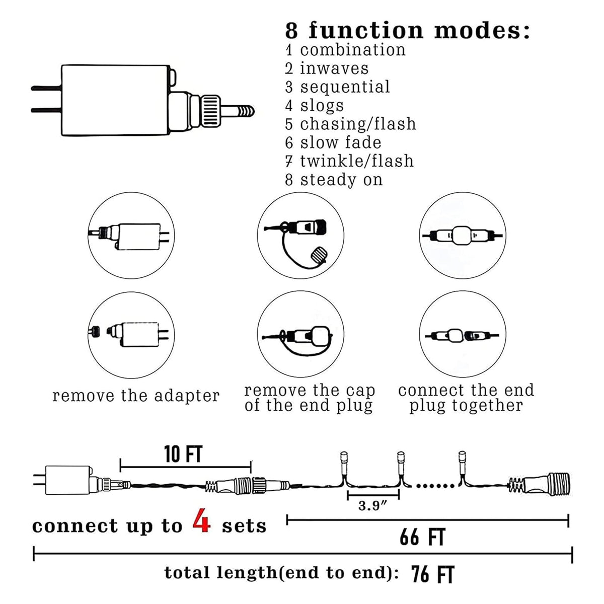 Q: What are the lighting modes available for the TW SHINE Christmas Lights?A: The TW SHINE Christmas Lights feature 8 different lighting modes including combination, slow glow, wave, sequential, chasing/flash, slow fade, twinkle/flash, and steady on, allowing you to create the perfect ambiance for any occasion.