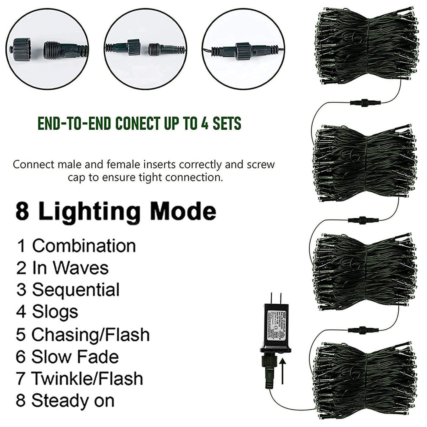 Q: How many lighting modes do these Christmas lights have?A: These Christmas lights feature eight different lighting modes, including combination, slow glow, wave, sequential, chasing/flash, slow fade, twinkle/flash, and steady on.