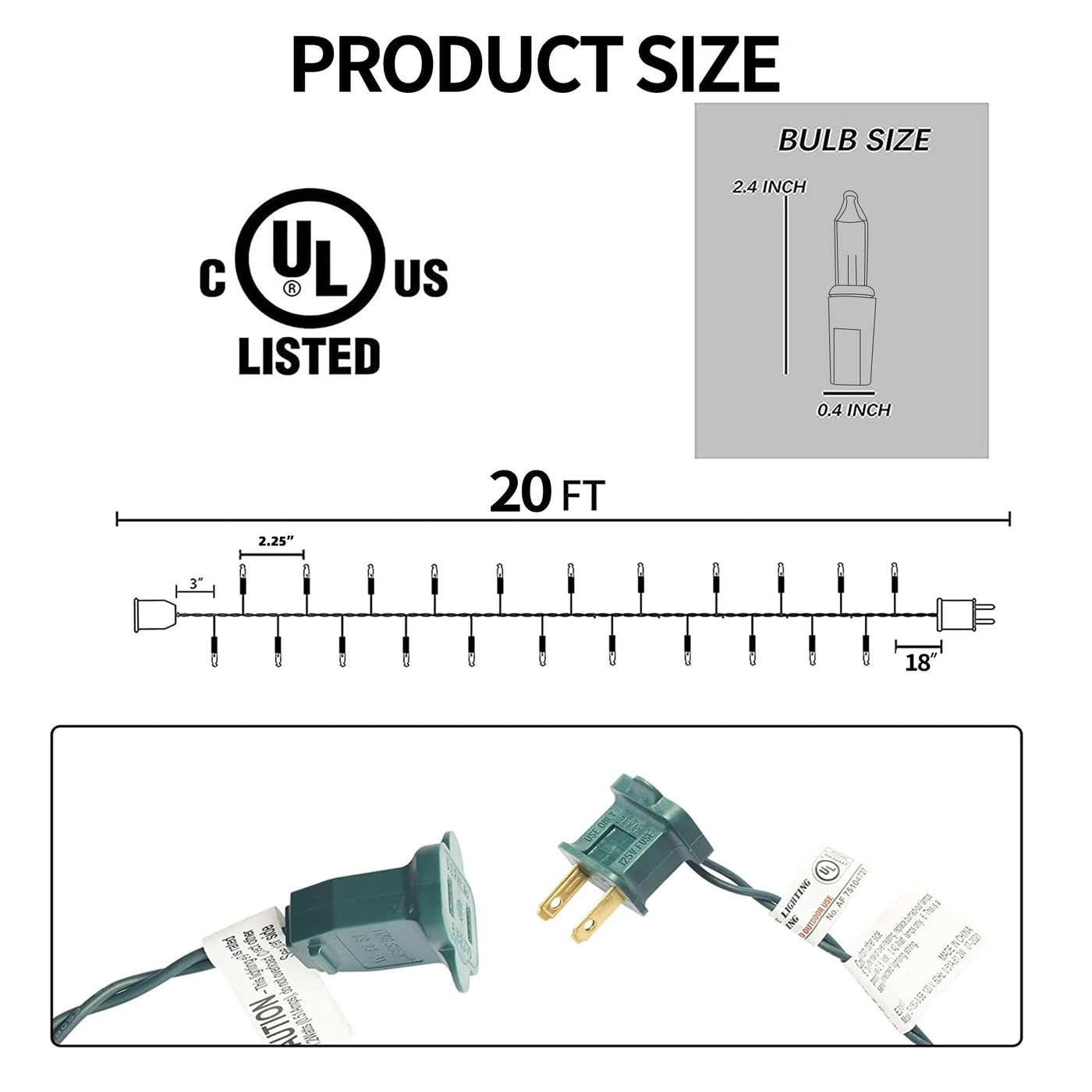 Q: How long is the TW SHINE Christmas lights string?A: The TW SHINE Christmas lights string is 20 feet long, with a lighted length of 18.5 feet and a leading wire of 1.5 feet.