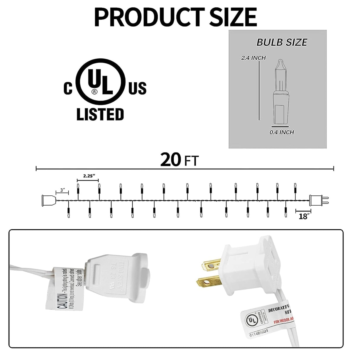 Measuring 20 feet in length and featuring 100 incandescent bulbs, these string lights are perfect for decorating various areas such as porches, roofs, gardens, and more. The warm white color adds a charming touch, while the durable construction ensures they can withstand various weather conditions. Each bulb operates at a safe voltage of 2.5V/0.42W and includes a built-in 3A fuse for added safety. The design allows for easy connection of up to six sets, creating an extensive lighting display without hassle.