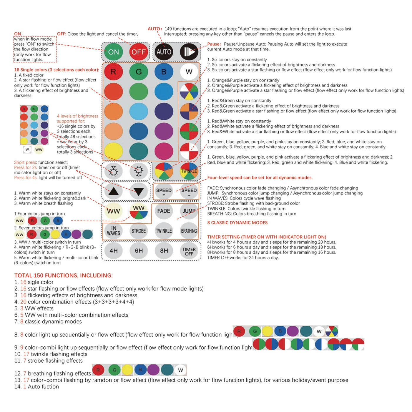 Q: How do I set the timer for the Christmas lights?A: The color-changing Christmas lights feature a timer function with three modes: '4H' (4 hours on/20 hours off), '6H' (6 hours on/18 hours off), and '8H' (8 hours on/16 hours off). To cancel the timer, simply press the 'TIMER OFF' button.