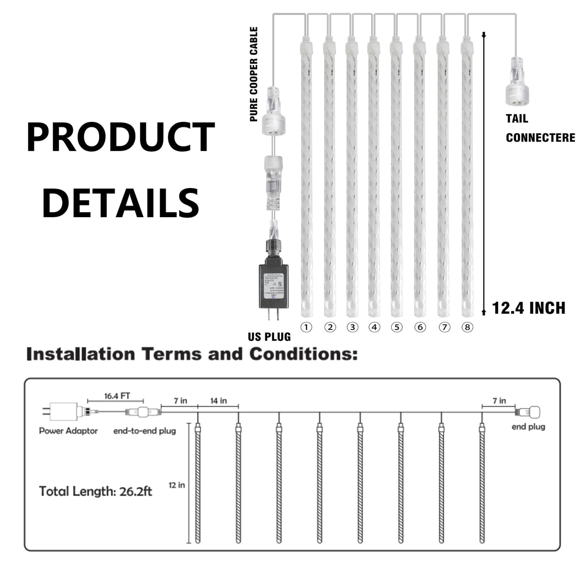 Q: What are the dimensions of the TW SHINE White Christmas Meteor Shower Lights?A: The TW SHINE White Christmas Meteor Shower Lights consist of 8 tubes, each measuring 30 cm (12 inches) in length. The wire between each tube is 40 cm (15.7 inches), and the leading cord is 2.1 m (6.9 ft) long.