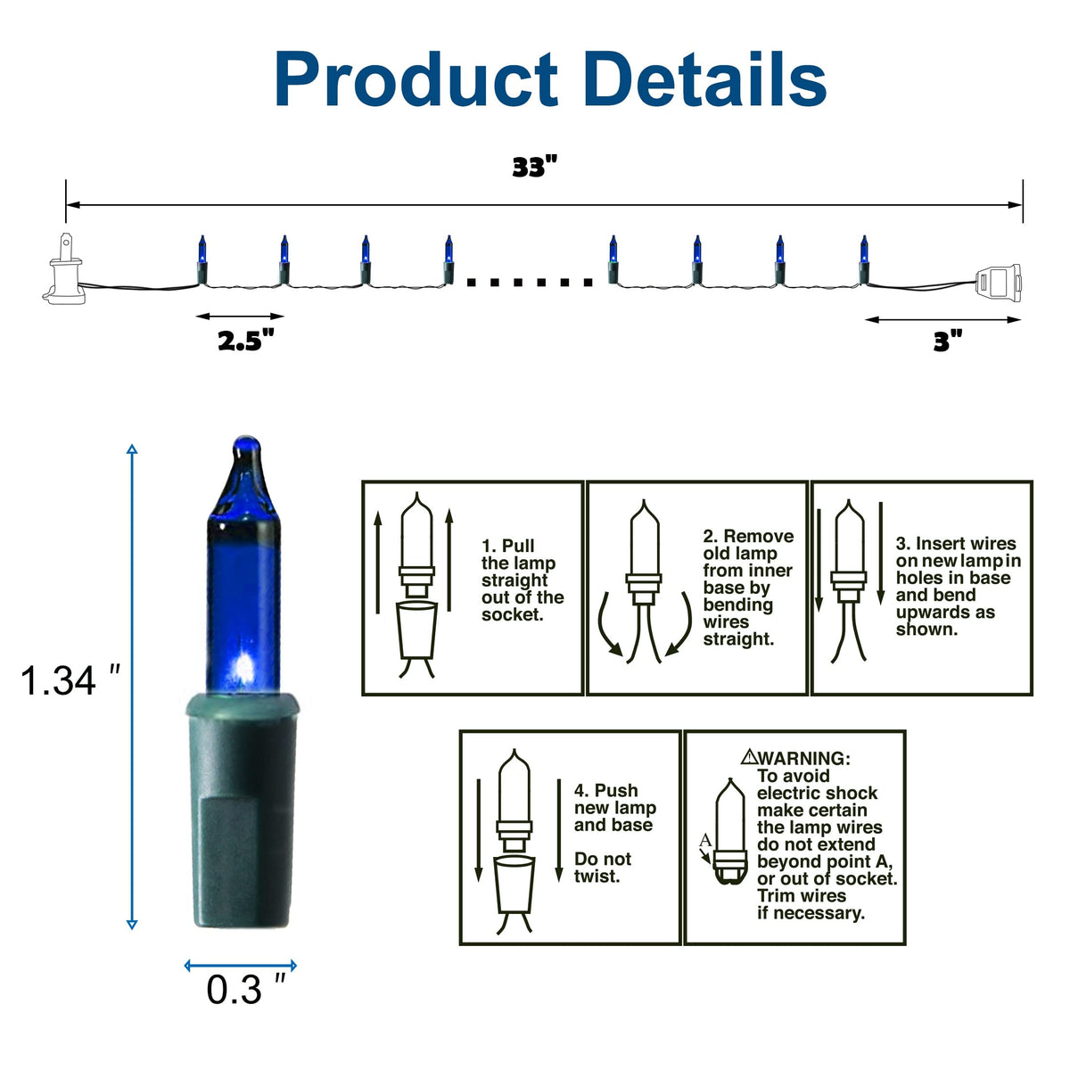 Q: Are the bulbs replaceable?A: Yes, the set contains replaceable bulbs, allowing you to prolong the life of the lights by replacing burned-out bulbs with two point five volt replacements.
