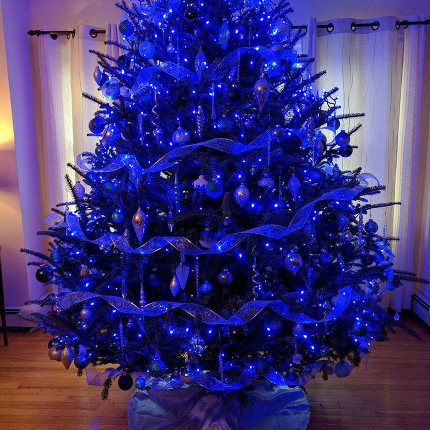Q: What is the color of the lights?A: The lights emit a blue color, providing a festive atmosphere for holiday decorations.
