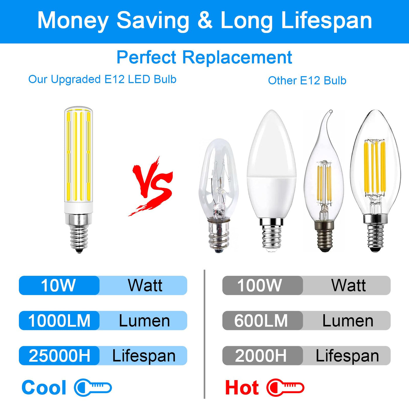 Non-Dimmable Material: Ceramic + PC Base Type: E12 LED Type: COB Working Voltage: AC110-130V Power: 10 Watt Color Temperature:6000K Cool White Package included: 2 Pack E12 10w led bulb 1. Efficient Illumination. Each E12 led bulb emits brightness with about 1100lm, improving the brightness of your Home. 2. Equivalent to 100W halogen light bulbs, with only 10W power consumption, saving electricity bills. Money saving and energy saving. 3. Easy installation. Installs into existing candelabra fixture with E12 base directly. 4. Long lifespan. More than 25000 hours lifespan, reducing bulbs replacing frequency. 5. Suitable for interior lighting, signal lights, lamps and fixtures of any suitable style in living room, bedroom and kitchen. Note: 1.Only for Indoor use .Turn off power before installation. Do not touch bulb when operating or when hot. 2.Please measure the size before purchase, as shown in the picture Make sure that the bulb size is suitable for your lights. 3.Please do not directly look at the bulb in close distance. It's bad for your eyes.''