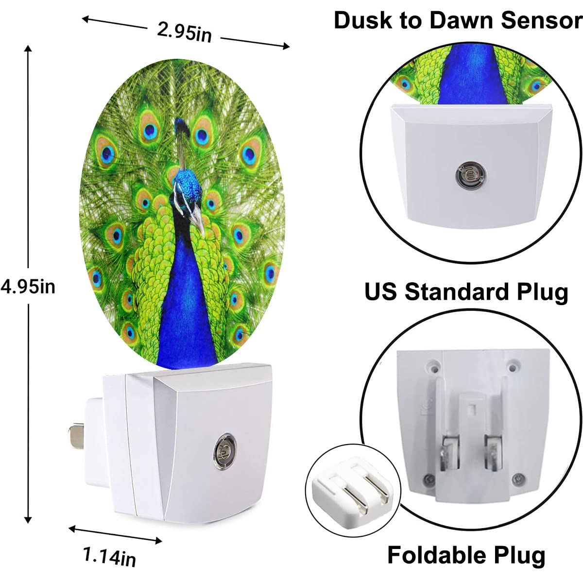 Night Light Blue Elegant Colorful Peacock Feather Night Lights Plug Into Wall 0.5W LED Lights Auto On/Off for Hallway Stairway Kitchen Home DecorWill your boys and girls even your mom and dad often bumping into things when they get up late at night because they can't see furnitures clearly? If yes, our plug in night light will perfectly help you to solve this problem. The night light is designed to be plug into wall but only take up one outlet, so you don't meed to take it away form outlet when you want to charge your phone etc. The plug-in night light has dusk to dawn sensor, you only need to plug nightlight into outlet and it will automatically turn on when dark and off in the morning.For Safety, please use the led night light indoor instead of outdoor.