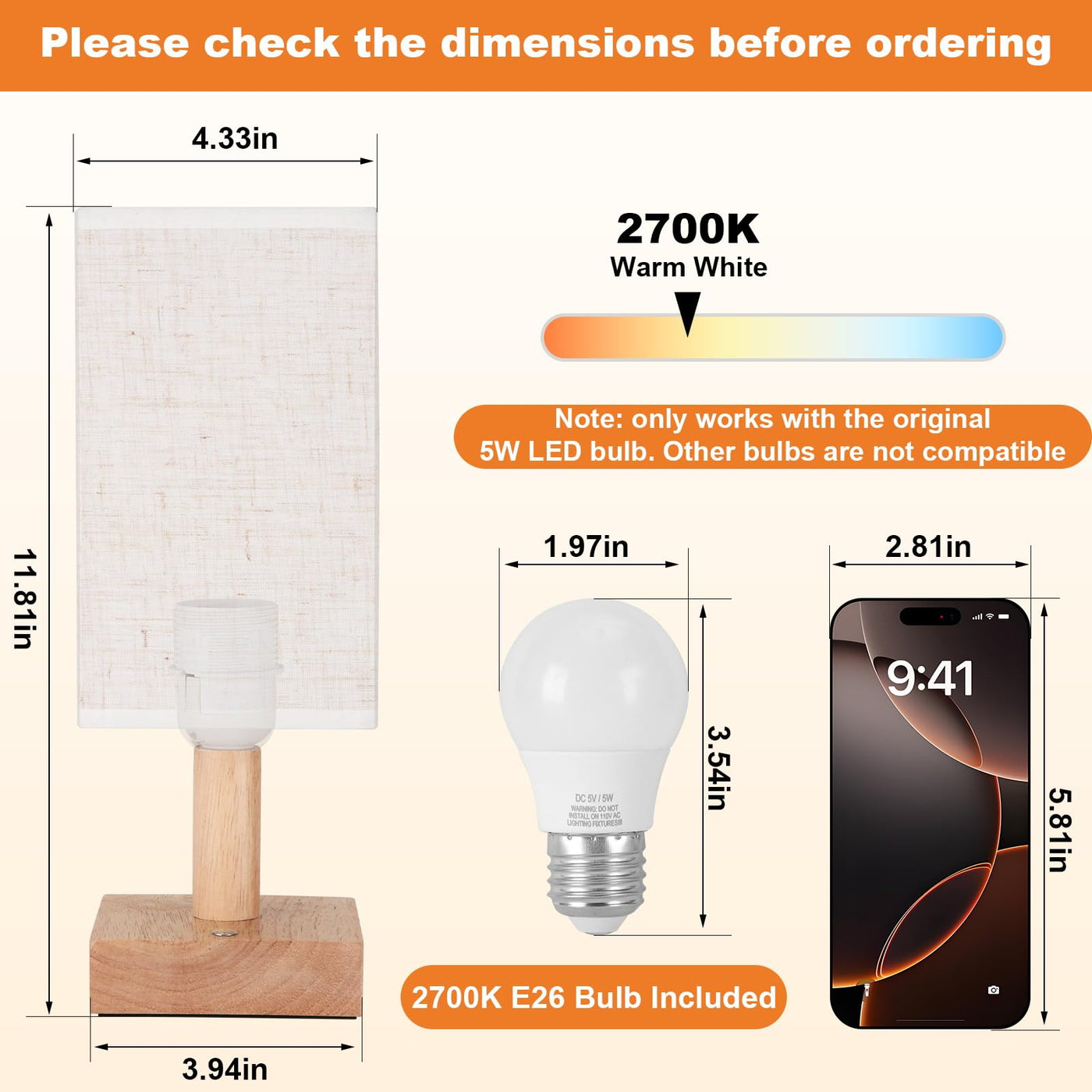 USB-Powered for Continuous Use: This versatile set of 2 corded touch square table lamps is designed for steady and uninterrupted use. Simply plug them in, and enjoy consistent lighting whenever you need it. Perfect for indoor spaces, these bedside lamps set of 2 bring warmth and comfort with ease. Simple, Elegant Touch Control for Your Comfort: Experience the convenience with our touch lamps set of 2. A simple tap to turn on/off, and a long press to smoothly adjust the brightness to your perfect level. Your favorite lighting level is remembered for next time. No more fumbling with switches-just the gentle touch of your finger. Soft, Warm Light to Create a Cozy Ambiance: With a color temperature of 2700K and 5W bulbs, these small bedside lamps set of 2 emit a soft, warm glow perfect for creating a relaxing atmosphere. Ideal for your bedroom, living room, or even as nightstand lamps set of 2, theyre designed to offer comfort and tranquility. Natural Wooden Base for a Touch of Nature: The small table lamps set of 2 feature natural wood bases that add a rustic, earthy charm to your space. Perfect for modern, minimalist, or cozy interior styles, these bedroom lamps set of 2 enhance any decor with their timeless appeal. Perfect Gift for Any Occasion: Thoughtfully designed and beautifully crafted, this lamp set of 2 makes the ideal gift for birthdays, anniversaries, or housewarmings. With their simple yet functional design, these white lamps set of 2 are sure to delight anyone who receives them. Energy-Efficient 5W Bulbs for Optimal Performance: Equipped with 5W bulbs, these lamps for living room set of 2 are designed to provide soft, warm light while being energy-efficient. Please note, only compatible bulbs are recommended-ensuring consistent brightness and longevity.