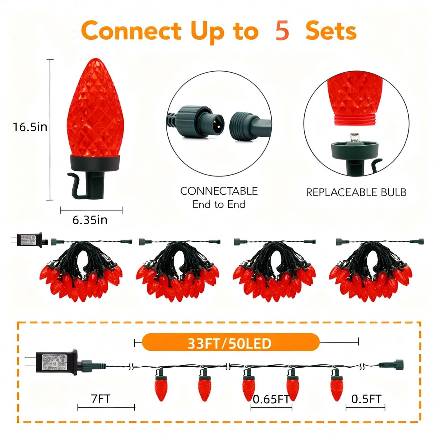 1. Commercial-Grade Durability: Thick Green Wire & Long-Lasting Brightness Tired Of Replacing Flimsy C9 Christmas Lights Every Holiday Season? Unlike Other C9 Led Lights With Weak Ultra-Thin Wires (They Break Easily On Eaves/Trees And Dim Fast) Our Lights Use well-made Weather-Resistant Green Wire. The Heavy-Duty Construction Resists Breaking And Overheating-Even After Hours Of Nonstop Use-So They Stay Bright And Reliable For Years. We Also Include 2 Spare Bulbs + 2 Spare Fuses (Seldom Needed But Handy Just In Case) To Save You From Last-Minute Hassle. 2. 8 Lighting Modes&Memory Function&well-made Replaceable Bulbs For Christmas String Lights: Switch 8 Modes (Combination Waves Sequential Slow Glow Chasing/Flash Slow Fade Twinkle/Flash Steady On) To Match Any Mood-Control All Via The Adapters Button. The Memory Function Lets You Skip Reselecting Your Favorite Mode Every Time You Power On. Bulbs Are Removable/Replaceable: If One Burns Out Others Stay Lit-No More Half-Lit Strands Ruining Decor! We Include 4 Spare Bulbs For Quick Fixes. Theyre Bright Enough To Light Your Yard Patio Or Roof Adding Perfect Festive Glow. 3. End-To-End Connectable: Cover Large Areas Freely No More Struggling With Too-Small Light Sets! Each C9 Christmas String Light Has An End-To-End Connector Supporting Connecting Up To 44 Sets Total. Mix And Match To Cover Large Areas Like Entire Roofs Sprawling Backyards Or Commercial Spaces-Customize Based On Your Needs! The Green Wire Blends Seamlessly With Natural Backdrops (Like Tree Branches) So You Can Hang Them Along Roofs Across Porches/Fences Or Wrap Around Trees For A Showstopping Holiday Display. 4. Ip44 Waterproof: Weatherproof For Year-Round Use Dont Let Rain Or Snow Ruin Your Decor! Our Outdoor Led Christmas Lights Are Crafted From well-made Weatherproof Materials That Withstand Heavy Rain Intense Sunlight And Cold Winter Temperatures-Leave Them Up Year-Round Without Worry. The Ip44 Waterproof Rating Lets You Use These Lights Indoors Or Outdoors So Rainy Days Wont Stop Your Festive Setup. Important Note: The Plug Is Not Waterproof-Keep It Away From Water To Avoid Damage. 5. Easy To Install & Versatile: Instant Festive Ambiance Diy Decorating Has Never Been Easier! Just Unroll The Christmas String Lights And Mount Them Wherever You Want-No Tools Or Professional Sreduces Needed. Enjoy The Fun Of Sprucing Up Your Space And Let These Lights Create A Warm Memorable Atmosphere Guests Will Love. Theyre Not Just For Holidays: Use Them For Daily Decor Christmas Parties Outdoor Weddings Summer Barbecues Or Even Neighborhood Block Parties.