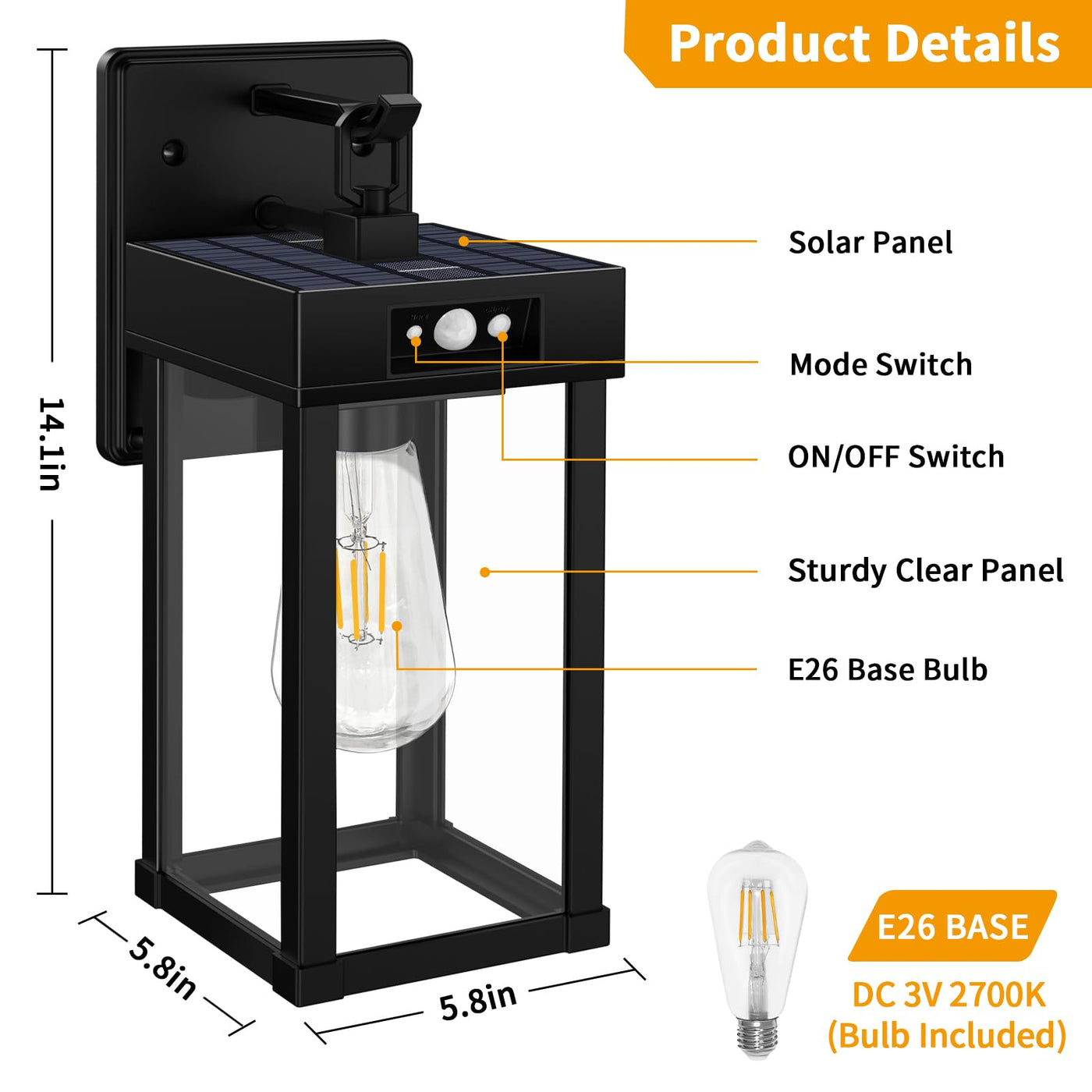 Q: What type of bulb is included with the Solar Porch Light, and is it replaceable?A: The Solar Porch Light includes one 2700K warm light bulb with an E26 base, which is easily replaceable. The open bottom design allows for hassle-free bulb replacement when needed.