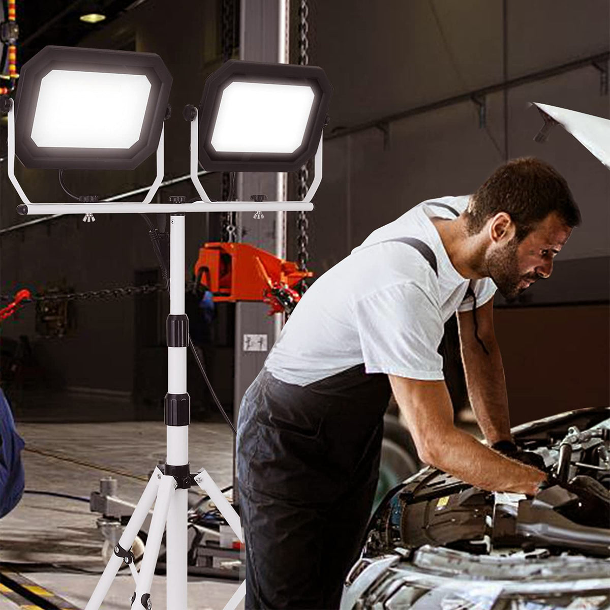 Ufond 20000 Lumen Work Lights With Stand, 200W Dual Head Led Work Light, Waterproof Lamp With Individual Switch, Adjustable Metal Telescoping Tripod 10Ft Power Cord