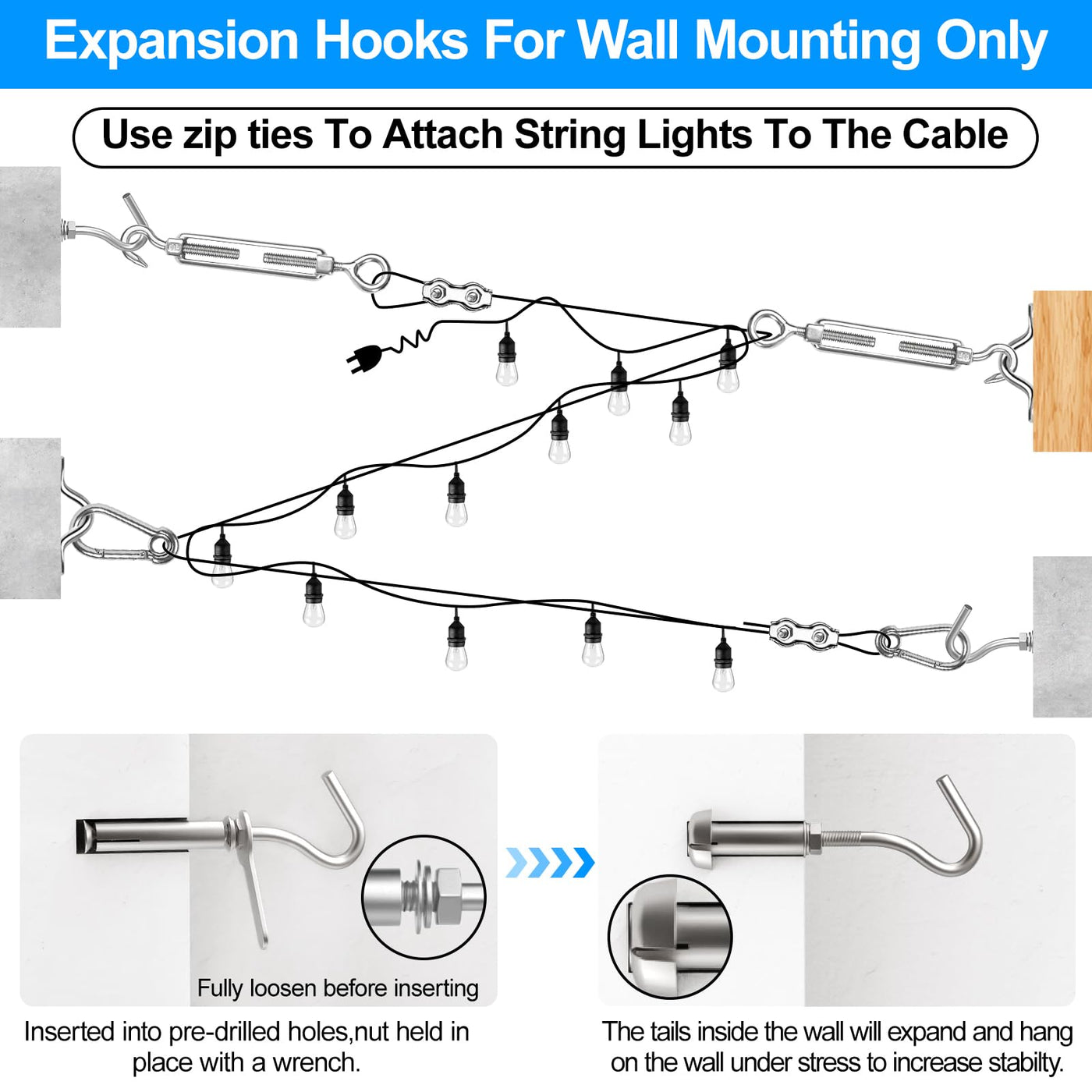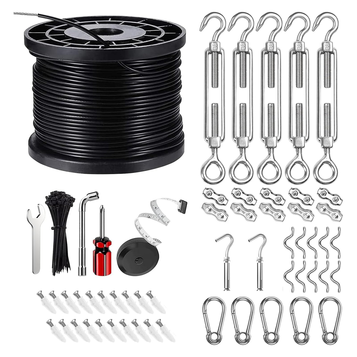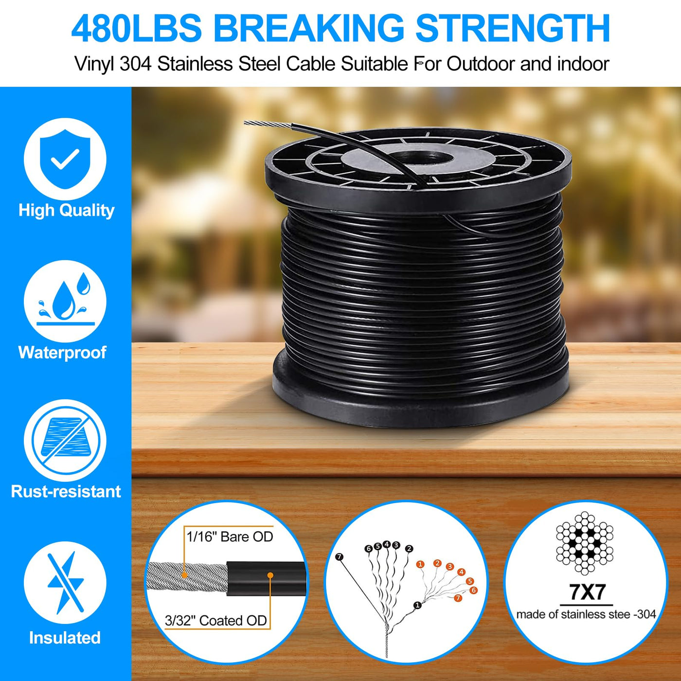 Ugarden Upgraded Outdoor String Light Hanging Kit, 170Ft Globe String Light Suspension Kit W/Expansion Hook, Stainless Steel 304 String Light Guide Wire, Black Guy Wire Kit For Wedding Dinner Barbecue