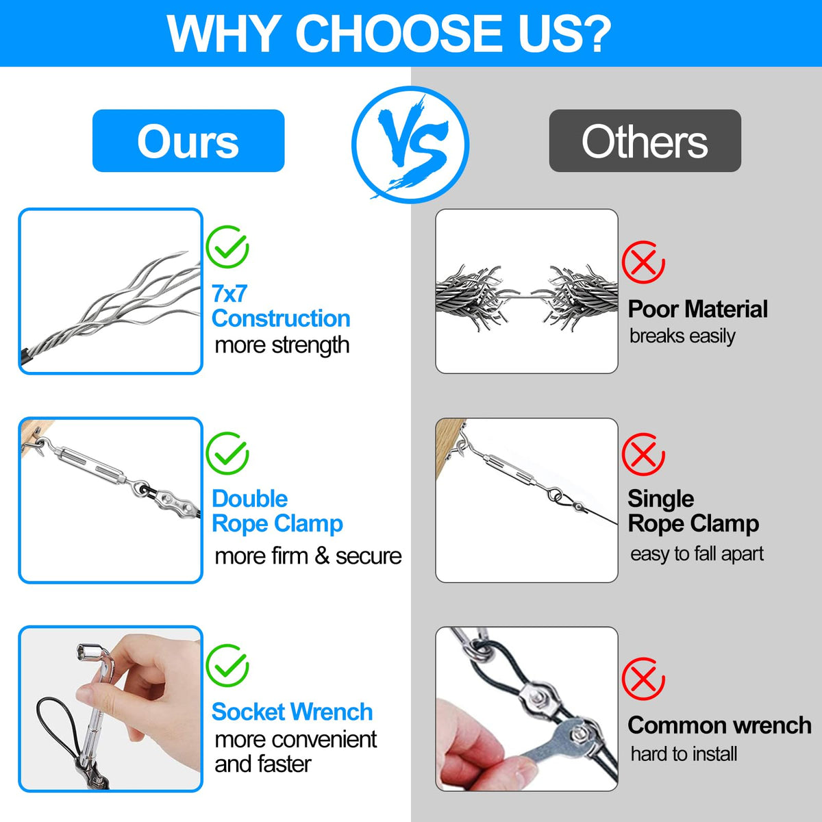 Q: What accessories are included with the UGarden String Light Hanging Kit?A: The kit comes with all the essential accessories needed for installation, making it easy for you to quickly set up the stainless steel hanging rope and hang your desired items without any hassle.