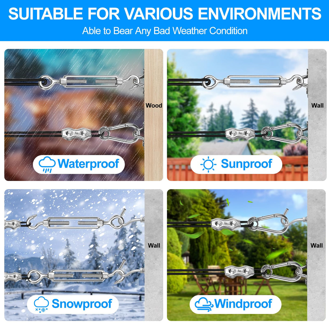 Q: What materials are used in the UGarden String Light Hanging Kit?A: The UGarden String Light Hanging Kit is made from high-quality 304 stainless steel, which is insulated, rust-resistant, and durable enough to withstand various weather conditions, including heavy rain and intense sun exposure.