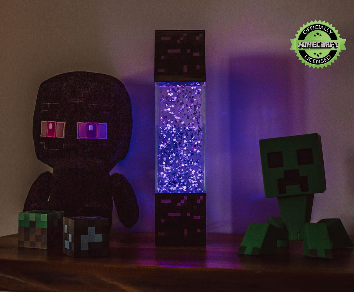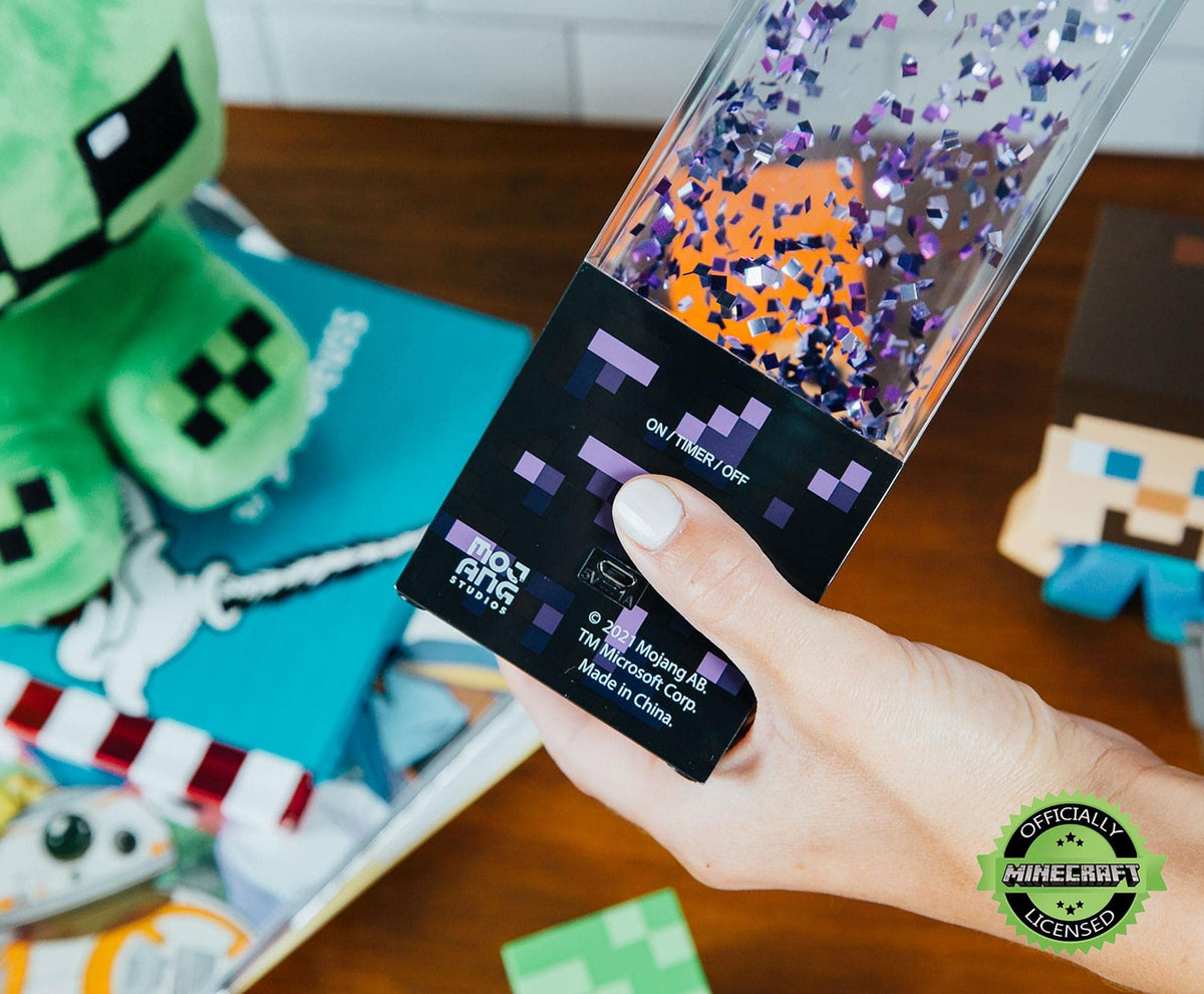 - **Floor To Ceiling Minecraft Fun**: At the flip of a switch, this 12-inch tall glitter-filled motion lamp emits a shimmering purple LED light. The convenient 15-minute auto-shutoff feature makes it an excellent nightlight for any age.
