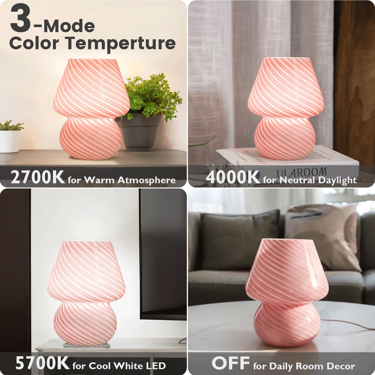 Q: What are the color temperature options for the ULAROOM Mushroom Lamp?A: The ULAROOM Mushroom Lamp features three adjustable color temperatures: 2700K (warm white), 4000K (neutral white), and 6000K (cool white), allowing you to create the perfect ambiance for any setting.