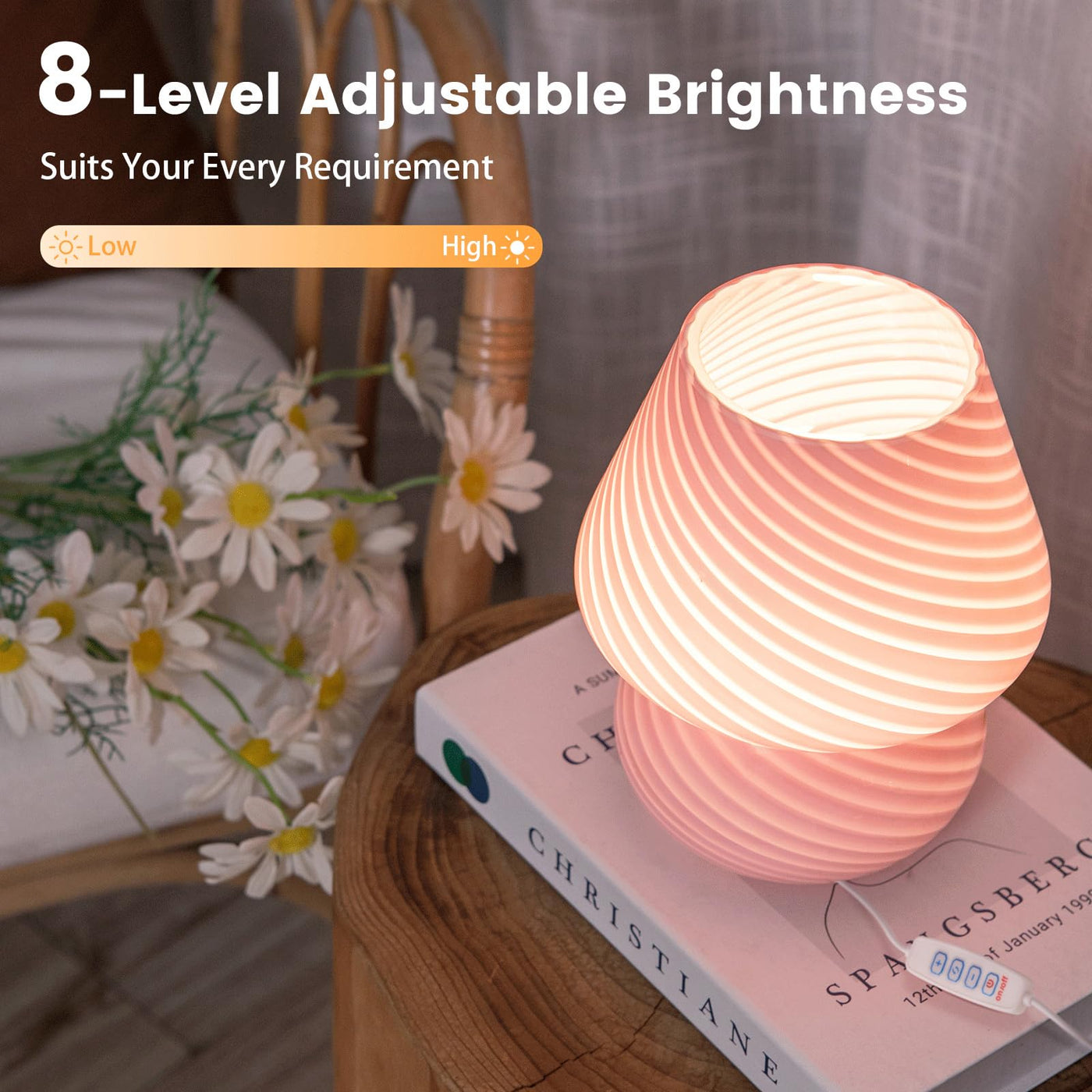 Q: How do I adjust the brightness on the Mushroom Lamp?A: You can easily adjust the brightness of the Mushroom Lamp by using the touch controls. Simply touch the '+' and '-' buttons to cycle through brightness levels ranging from 20% to 100%.