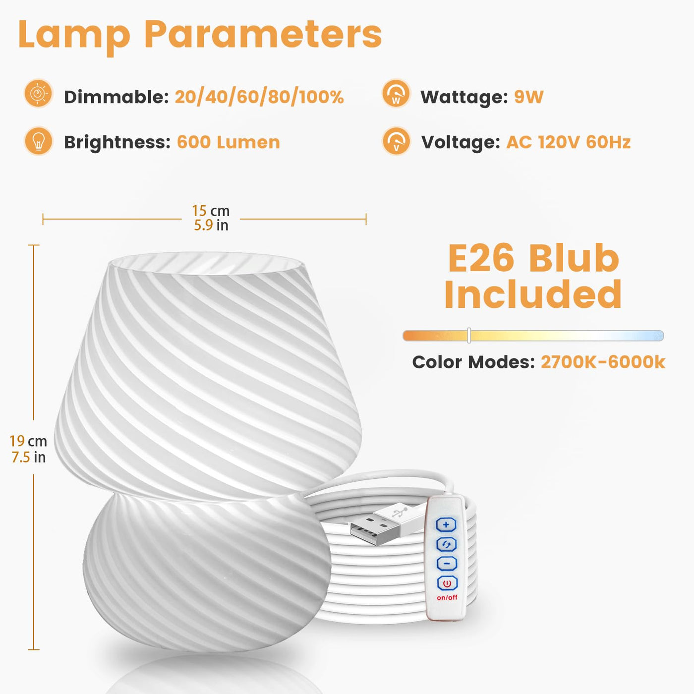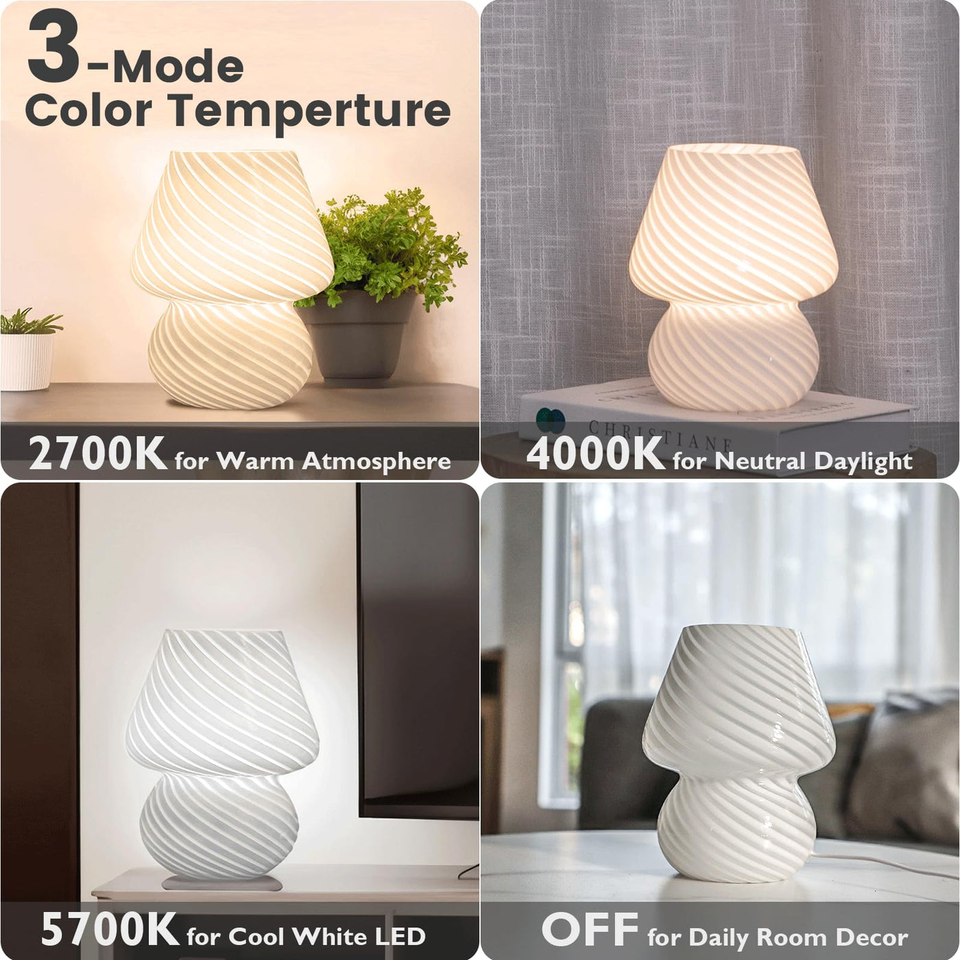 Q: What are the different color temperatures available for the ULAROOM Mushroom Lamp?A: The ULAROOM Mushroom Lamp offers three adjustable color temperatures: 2700 K for a warm glow, 4000 K for a neutral light, and 6000 K for a cool, bright light. Simply touch the switch on the lamp to switch between these settings.