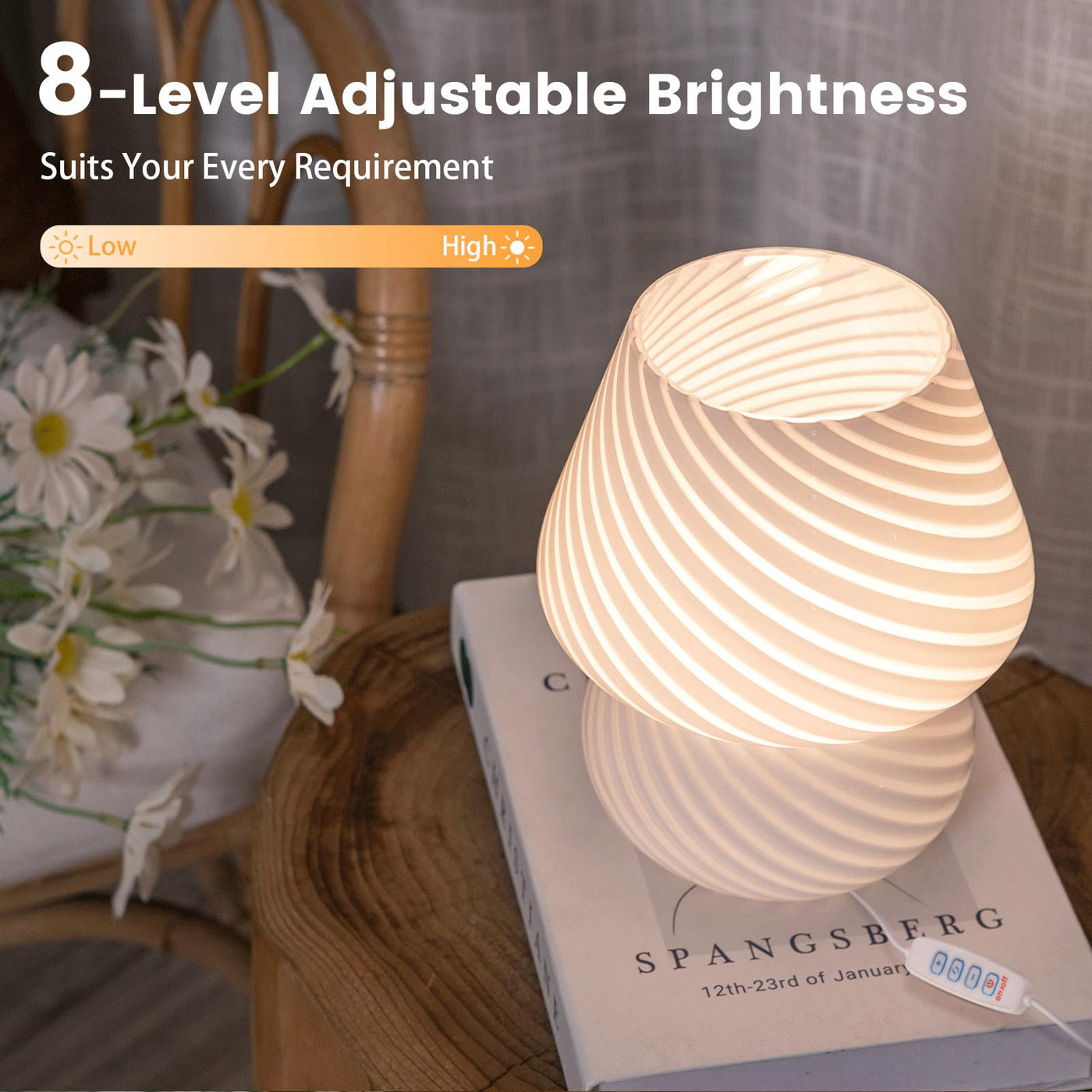 Q: How do I adjust the brightness of the ULAROOM Mushroom Lamp?A: You can easily adjust the brightness of the ULAROOM Mushroom Lamp by touching the '+' and '-' buttons on the lamp. It features a brightness cycle mode that allows you to select from five levels: 20%, 40%, 60%, 80%, and 100%.