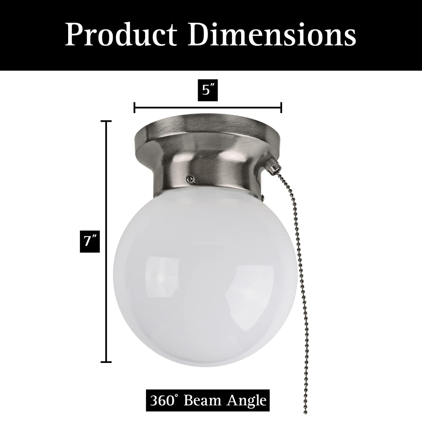 The ceiling light features a sleek globe design with opal glass, complemented by a durable brushed nickel finish. Its compact size of 4.9”W x 7”H makes it an ideal choice for areas where space is limited. Built with an integrated 9W LED, this fixture emits 500 lumens of 3000K light, providing a bright and inviting atmosphere. The sphere-shaped opaque lens ensures optimal light diffusion, enhancing the aesthetic of any room.