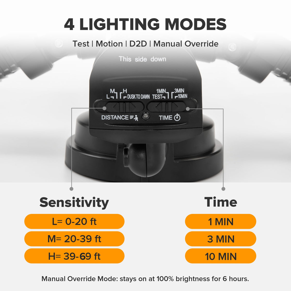 Q: How does the motion sensor work on this security light?A: The motion sensor on the UME security light detects movement within a 180° angle and can sense motion from distances up to 69 feet. You can also set the lighting duration for 1, 3, or 10 minutes, providing flexibility for various security needs.
