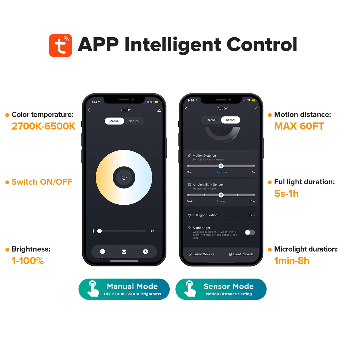 - **APP Remote Control via WiFi**: Easily connect to your smartphone using 2.4GHz WiFi. Download the free "TuyaSmart" or "Smart Life" app (compatible with Android & iOS) to adjust settings such as brightness, color temperature, motion distance, and duration, customizing your own security model effortlessly.