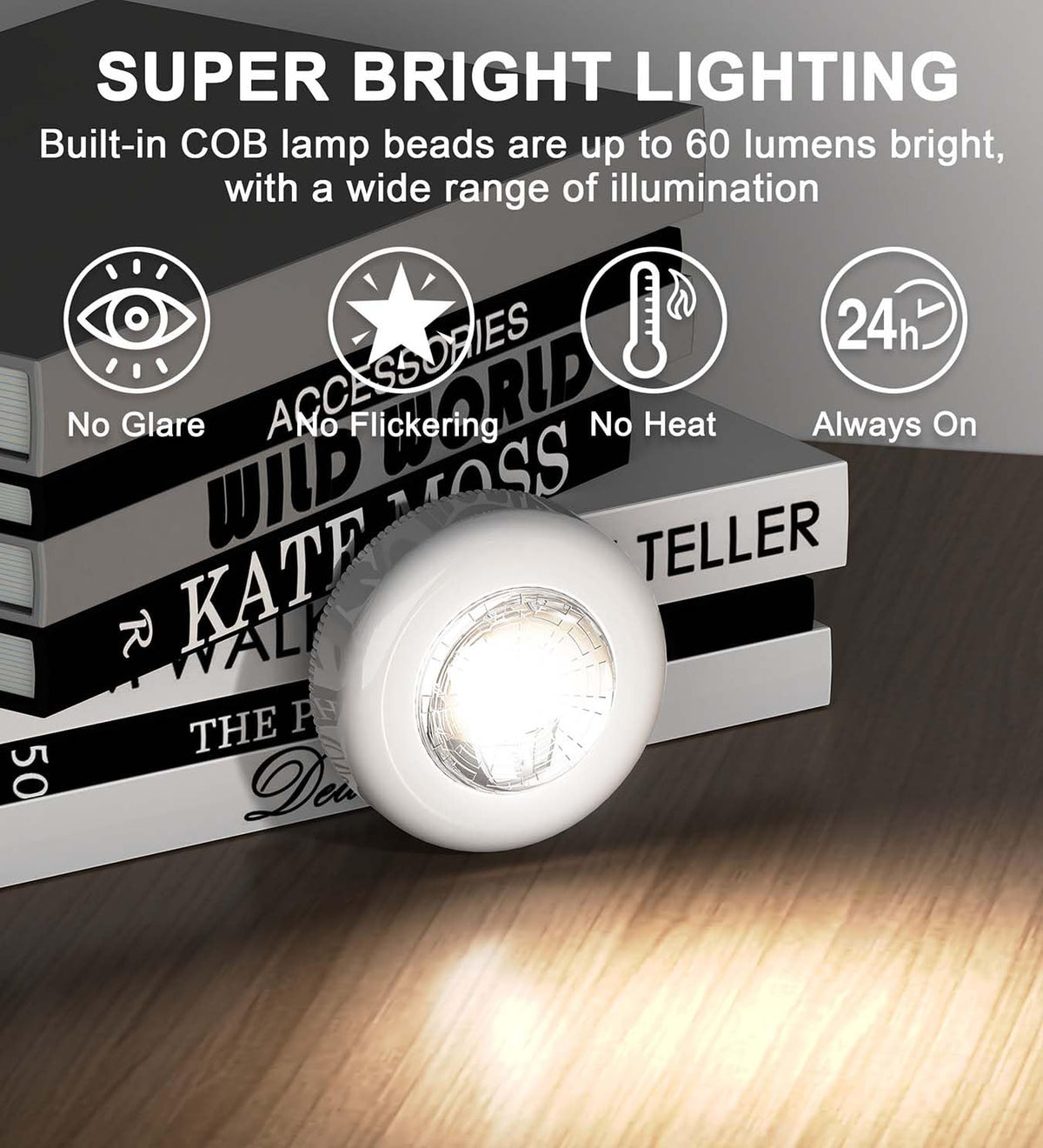 Powered by three AAA batteries (not included), this tap light can provide up to 120 hours of continuous lighting, making it an excellent choice for emergency situations or as a camping aid. The self-adhesive pad on the back allows for simple installation on various surfaces, including walls, under cabinets, and inside closets, without causing damage.