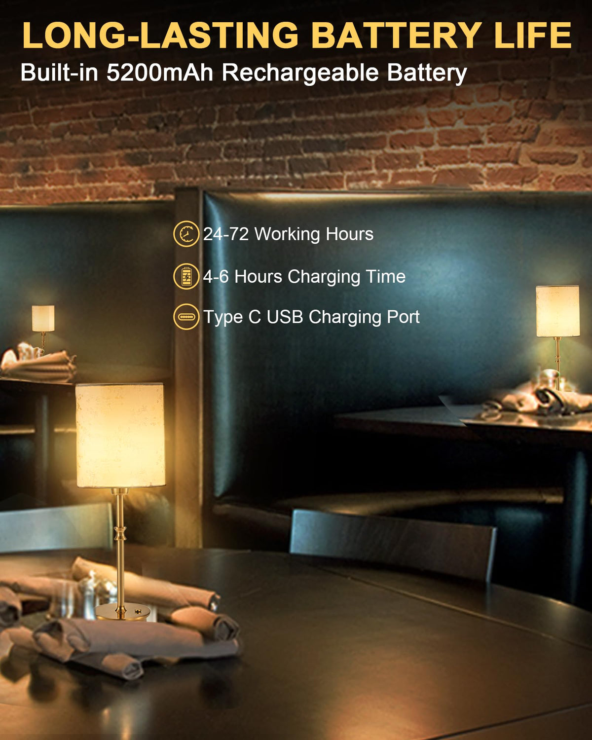 Q: What is the battery life of the UMEXUS Cordless Table Lamp?A: The UMEXUS Cordless Table Lamp is equipped with a built-in 5200mAh rechargeable battery that provides 24-72 hours of illumination after a charging time of just 4-6 hours.