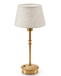 Cordless LED Table Lamp with Dimmer, 5000mAh Built in Rechargeable Battery, 3 Level Brightness, Patio Table Lamp, Dimmable Ambient Light for Restaurant, Dining Room, Bedroom, Bedside, Bar, Outdoor, Camping, Balcony Features: Material: Real fabric shade, antique brass finish and the metal baseThree brightness settings. Simply change the intensity of the light by touching the power button once, sequentially to achieve the desired brightness. Work Time: This battery operated table lamp lights up for 48 hours at maximum brightness and up to 24 hours in dimmed state (depending on working brightness).Power Supply: 5000mAh cordless rechargeable table lamps Charging Time: About 4 to 5 hours Charging Port: USB type-c charging port Top Shade Diameter: 6.10 Base Diameter: 3.93 Height: 13.97 The brass finish, white/blue fabric shade, and unique pattern create an antique charm that complements any space in your living room bedroom dining room meditation room bathroom vanity home office indoor outdoor.br>Place it on dining table entryway table fireplace mantel shelf side table coffee table bedside table to create a romantic atmosphere. Additionally, you can take it to restaurant bar party, garden back porch patio poolside balcony camping to entertain or play a card! Package Include: a rechargeable cordless lamps with a free LED bulb, an UL listed US plug, an USB type-c cable and a user manual