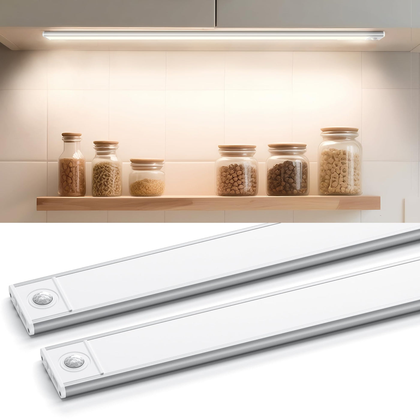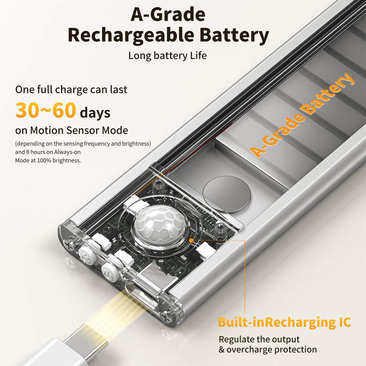 Light up your space with this upgraded 16-inch motion sensor light, designed for smart convenience and ultra-bright performance. Featuring 108 high-efficiency LEDs, this rechargeable light offers 3 working modes: Night Mode (motion-activated in the dark), Daylight Mode (motion-activated even in bright settings), and Always-On Mode for continuous lighting. You can easily customize your environment with 3 color temperatures-warm (3000K), natural (4000K), and cool white (6000K)-plus stepless dimming from 10% to 100% brightness. Whether you need a soft night light, bright task lighting, or mood lighting, this fixture delivers. The built-in rechargeable Li-polymer battery lasts 8-30 days on motion mode or 8 hours in Always-On Mode. No flicker, no glare-just soft, eye-friendly light through a frosted diffuser. Install in seconds using magnetic backing or included adhesive strips-no tools, no wires. Perfect for kitchen cabinets, closets, bookshelves, stairways, hallways, garages, laundry rooms, and more. This versatile night light is a thoughtful gift and a smart home upgrade.