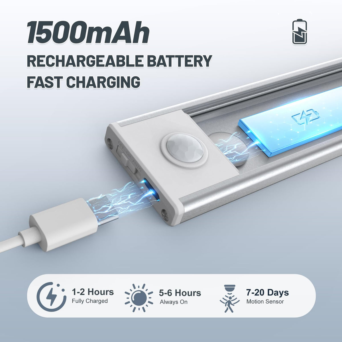 Q: What is the battery life of the rechargeable LED lights?A: The under cabinet lights have a built-in 1500mAh rechargeable battery. In maximum brightness mode, they can last for about 5 to 6 hours of continuous use. In sensor mode, they can last anywhere from 7 to 20 days, depending on how often the motion sensor is triggered. It only takes 1-2 hours to fully charge.