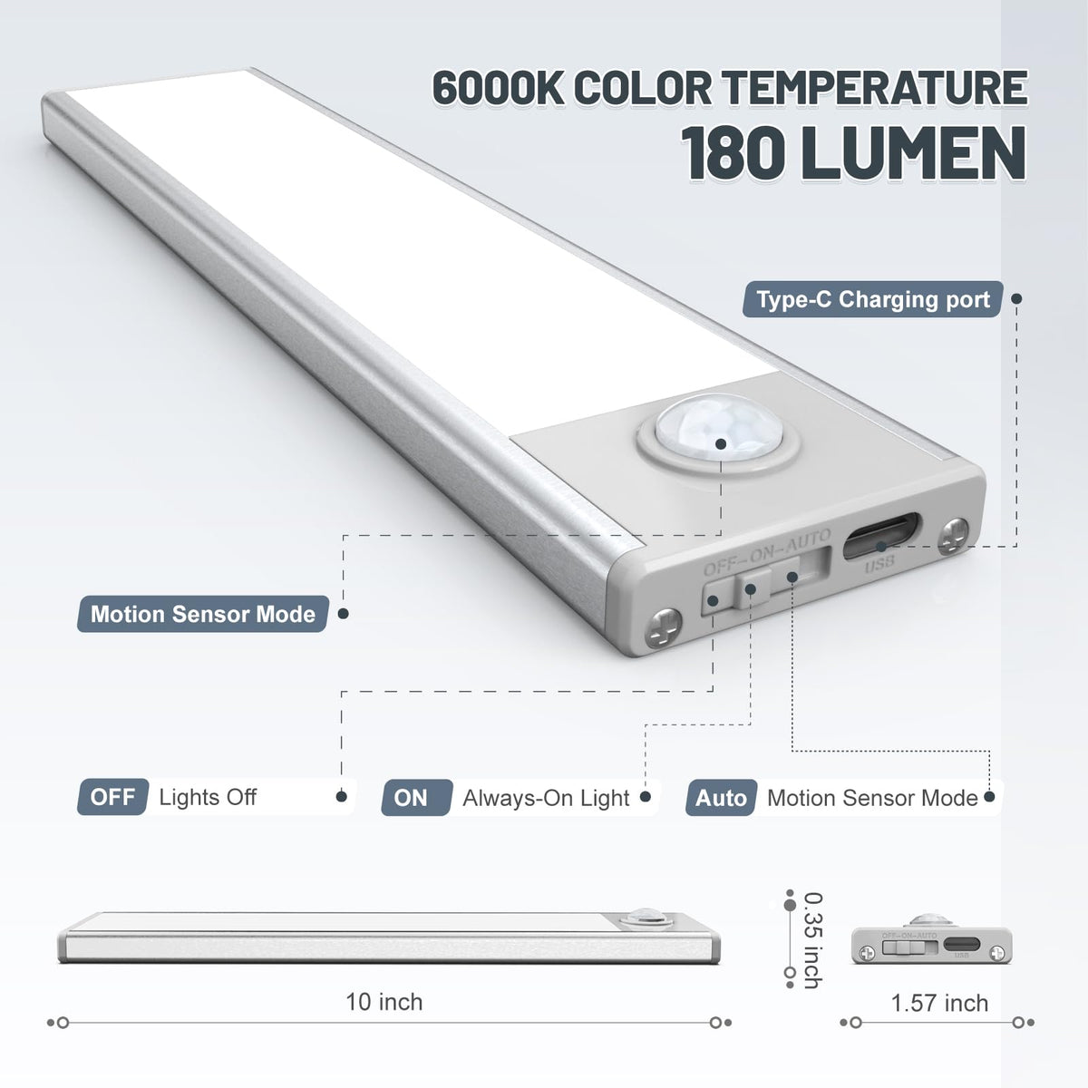 Light Up Every Corner With These Versatile Under Cabinet Lights. Equipped With 40 Led And A Motion Sensor That Automatically Turns On When You Get Within 120? And 10 Feet, These Indoor Motion Sensor Lights Provide Plenty Of Light For Your Kitchen, Closet, Bedroom, Cabinet, Basement, Pantry, Hallway, Or Stairs. The Rechargeable Batteries And Magnetic Design Make Installation Easy With No Wires Or Tools Required, So You Can Stick The Cabinet Lights Anywhere You Need Extra Light. These Under Cabinet Lighting Wireless Come In Packs Of 6 To Ensure You Have Enough Lights To Illuminate Multiple Areas. The Bright White Light Creates A Cozy Atmosphere. Up To 5-6 Hours Of Use On A Single Charge. These Closet Lights Are 10 Inches Long And Fit Perfectly Under Cabinets Or In Tight Spaces. Give Your Home A New Look With These Convenient, Energy Efficient Under Cabinet Lights
