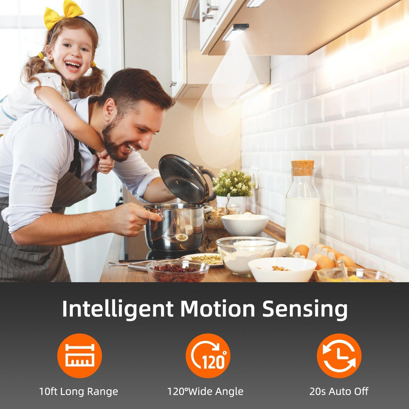 Q: How does the motion sensor work on the under cabinet lights?A: The under cabinet lights are equipped with an upgraded motion sensor that detects human movement within a 120° angle and up to 10 feet away in dark or low-light environments. When motion is detected, the lights automatically turn on and will stay lit for about 20 seconds after motion ceases.
