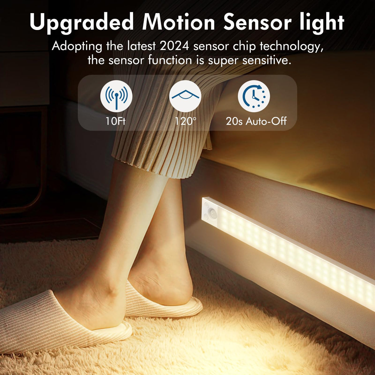 Q: How does the motion sensor work on the Under Cabinet Lights?A: The Under Cabinet Lights feature an upgraded PIR sensor that detects human movement within a range of 10 feet and an angle of 120°. The light automatically activates when someone or a pet is nearby and turns off after 20 seconds of no movement.