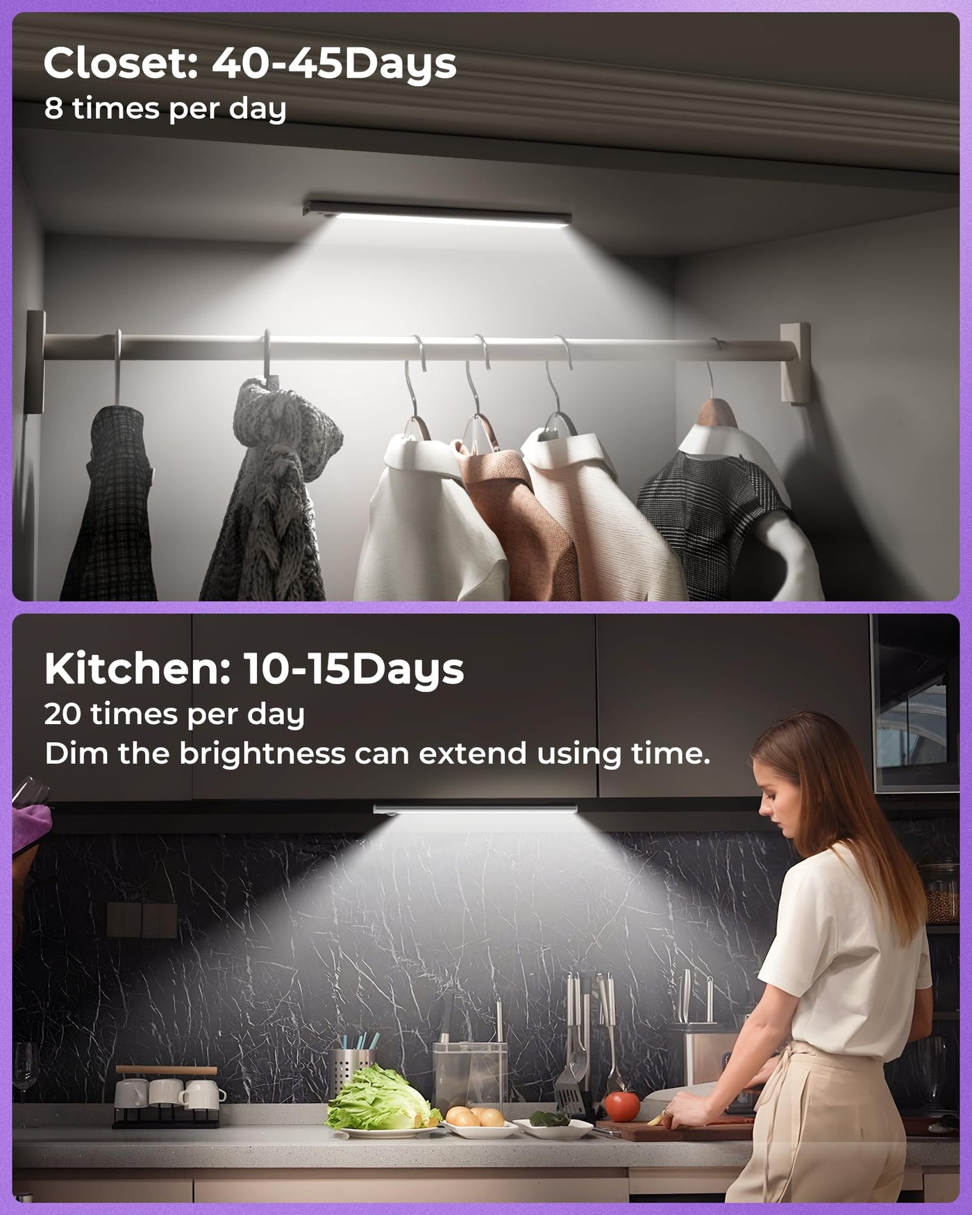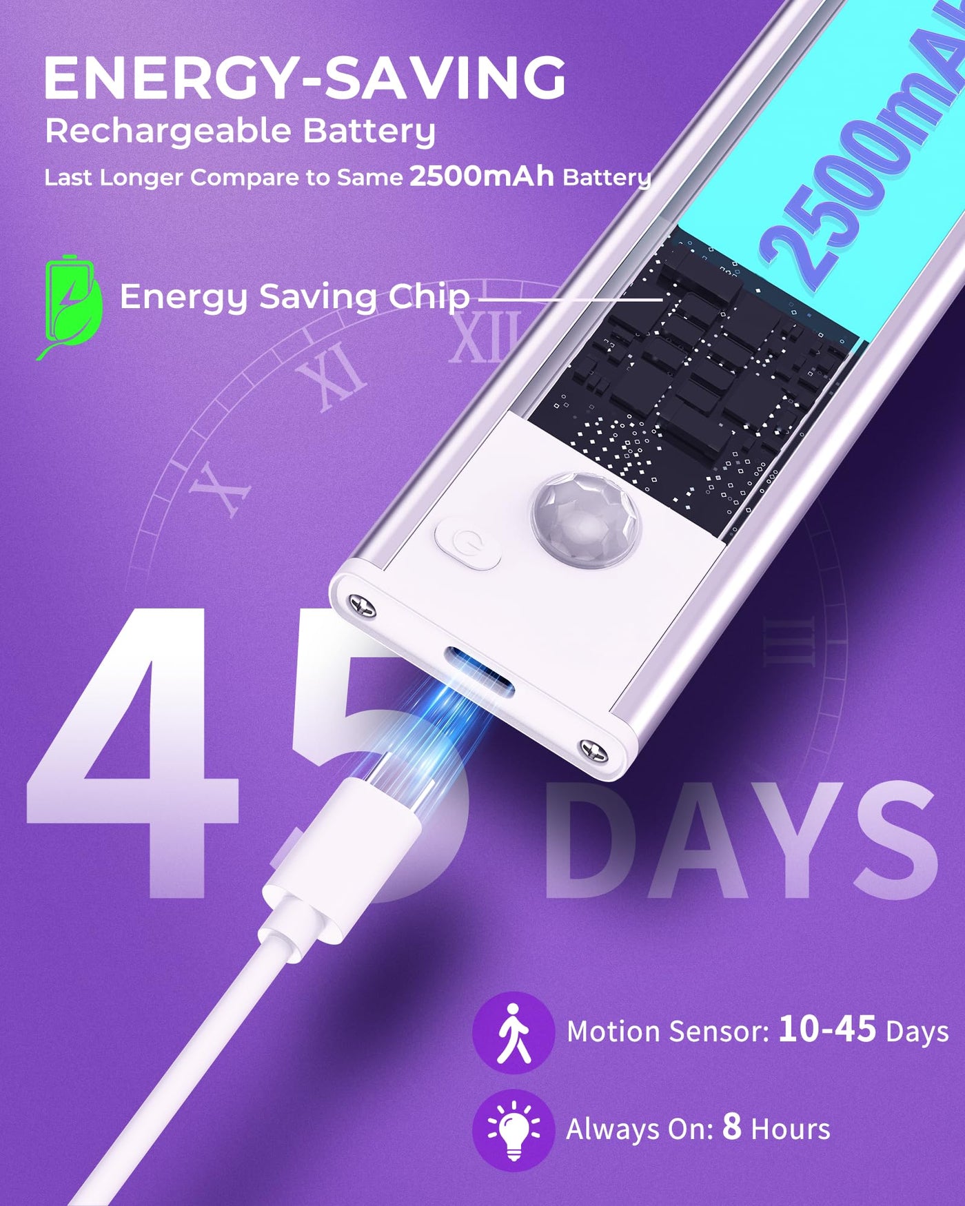Q: What is the battery life of the rechargeable under cabinet lights?A: These under cabinet lights come with a 2500mAh rechargeable battery that can last significantly longer after a quick charge via the USB-C port. Depending on usage, the lights can last up to 30 days in motion-sensor mode.
