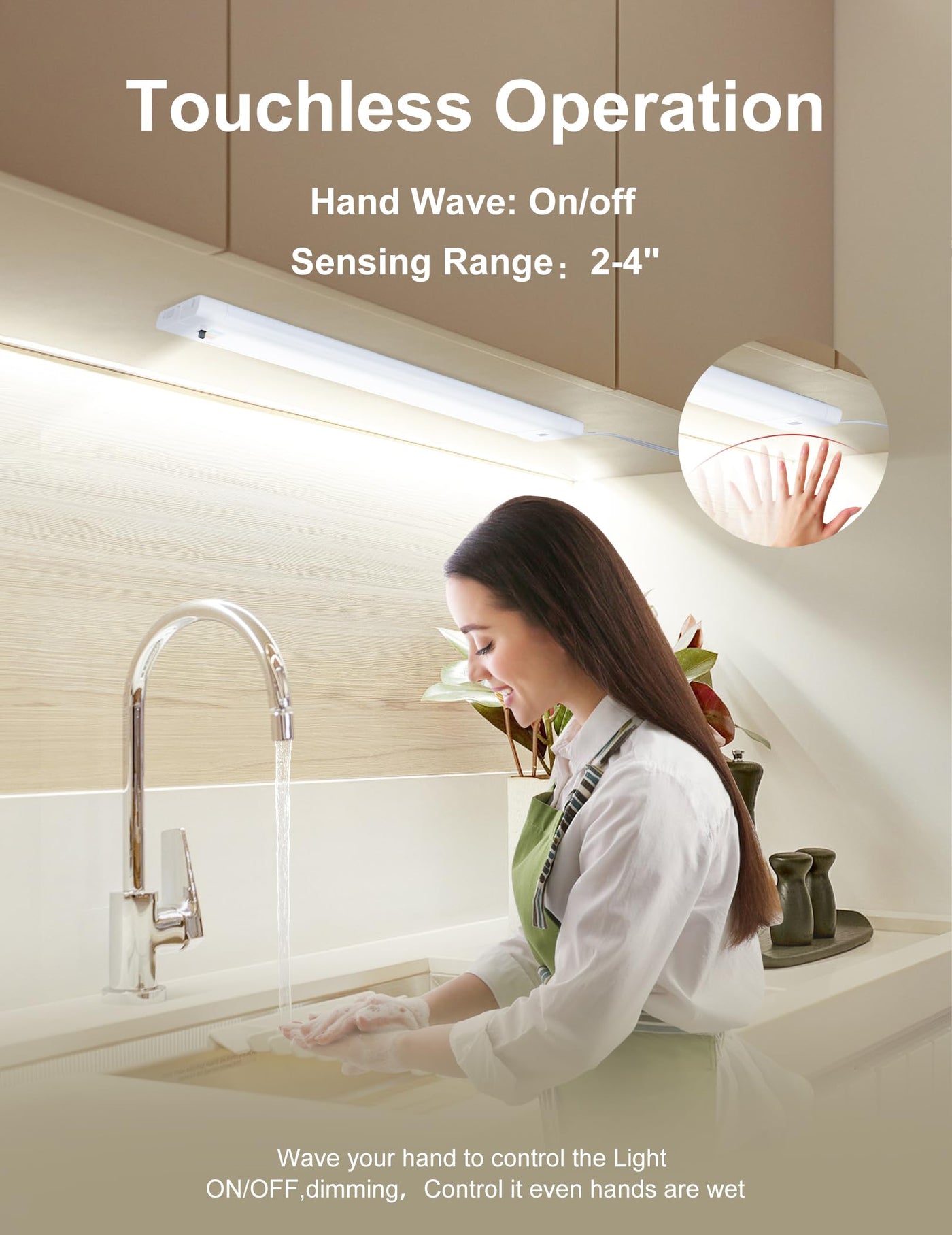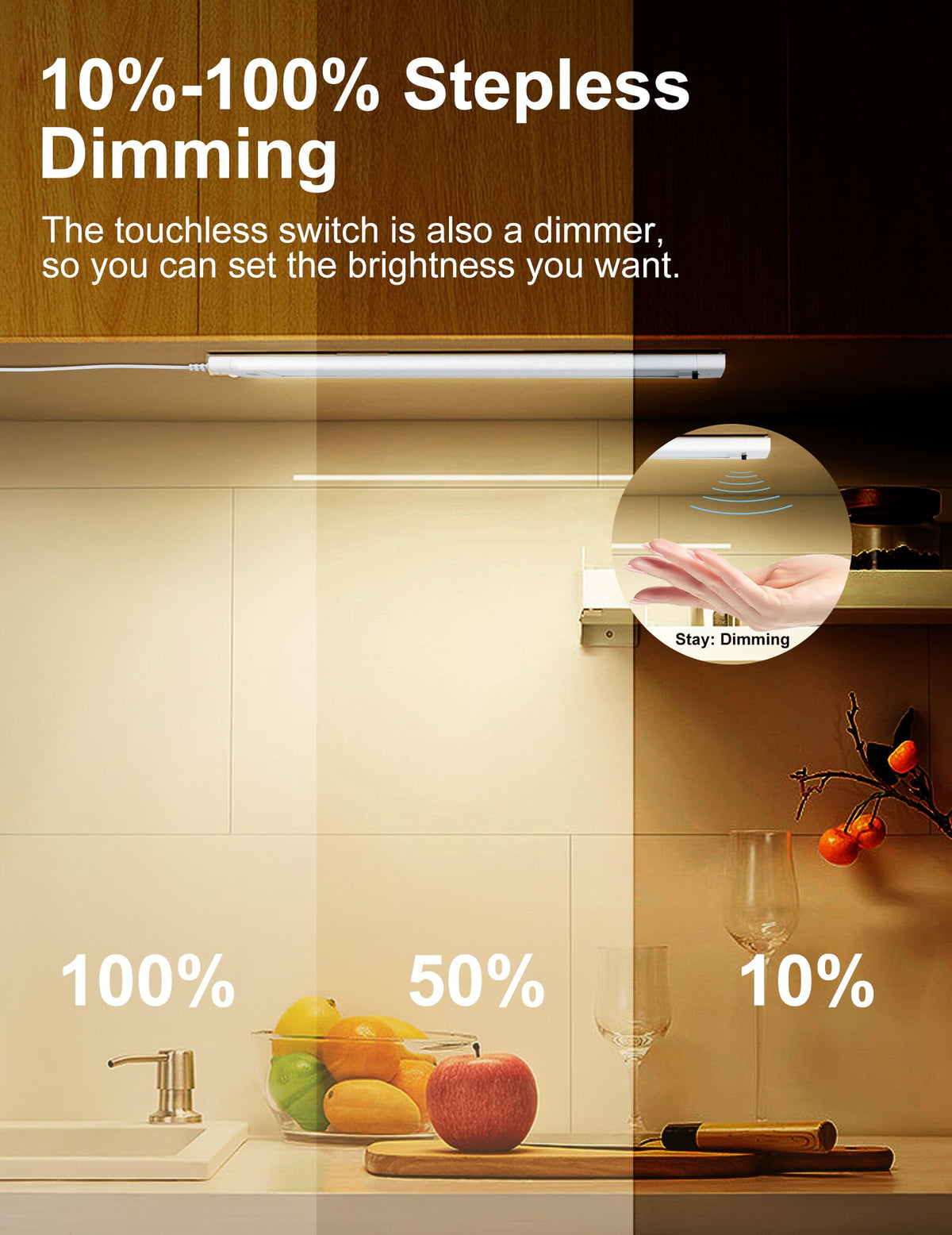 Q: Is the light dimmable and how do I control it?A: Yes, the Under Cabinet Light is dimmable and features touchless control. You can simply wave your hand to turn the light ON/OFF and adjust the brightness, minimizing contact with the fixture.