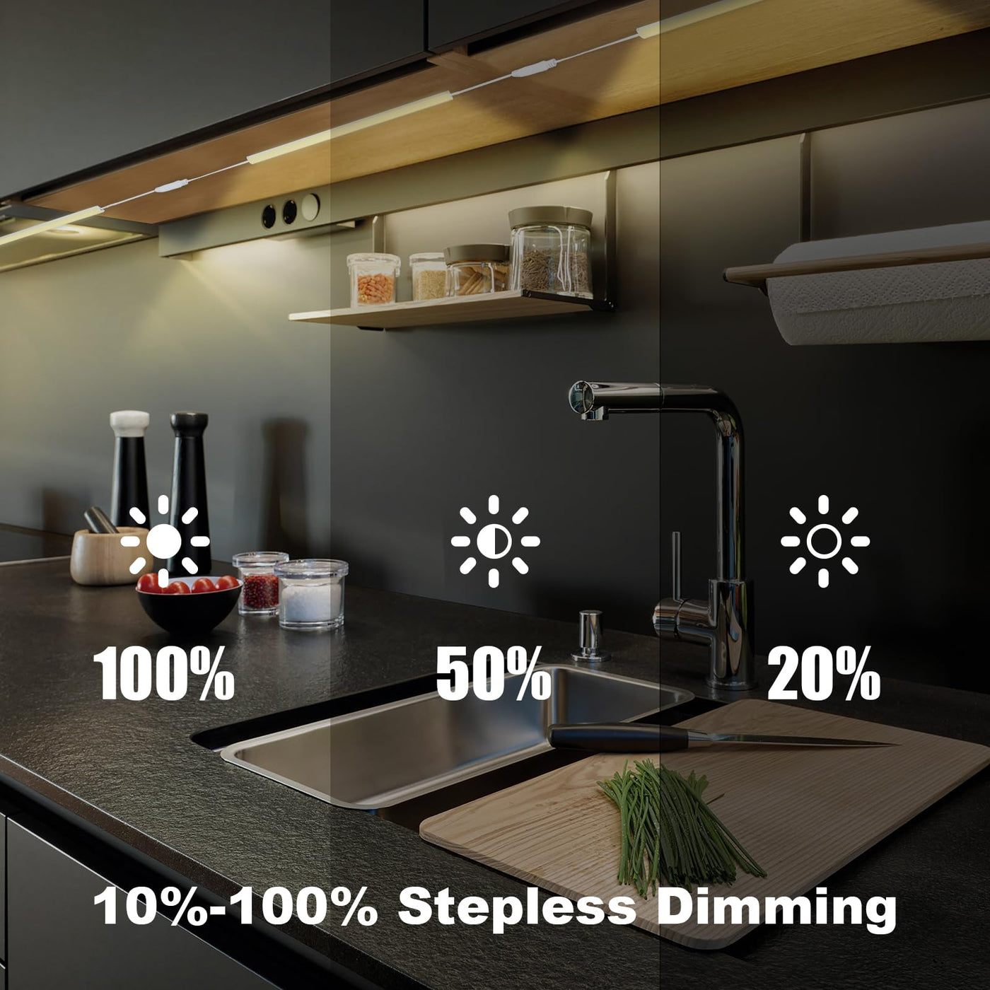 Q: Can I adjust the brightness of the Under Cabinet Lights?A: Yes, these lights feature a touch dimmer that allows you to adjust the brightness from 10% to 100% with a long press, and you can easily turn them ON/OFF with a short press.