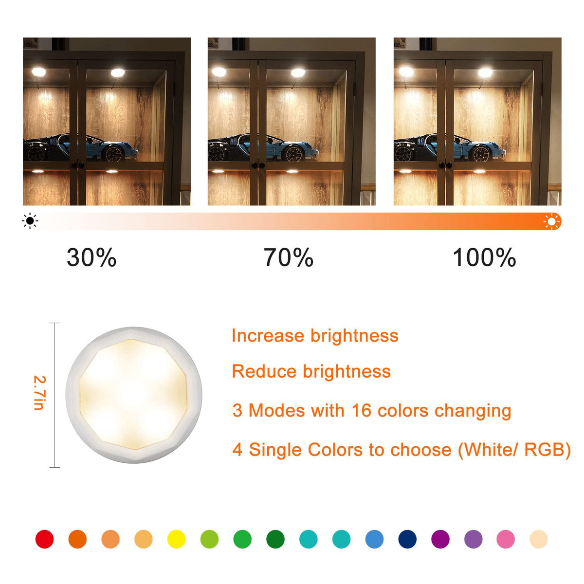Rechargeable Puck Lights Product Information.Brightness: 80 LM. Puck Light color: warm white (3500K) or 16 kinds of color changes Power: Built-in 800mAh rechargeable lithium battery. Charging method: Micro-USB charging. When fully charged: the indicator light changes from red to greenPower input: DC5V/1APower: 0.5-1.0 WOperating voltage: 3.5-4.5 V. Operating current: 120 mACharging time: about 2 hours. Working time after full charge:15-20 hours. Remote control distance: 0-3 meters. Remote control power: with CR2025 button cellFeatures. Memory function Adjustable brightness 4 hours automatic shut down Timer 16 color variations. Package List.1 x RGBW LED spotlight 1 x USB charging cable1 x Remote Control 2 x Adhesive1 x User Manual Hassle free purchase. (12 months warranty, if there is any problem, please reply within 12 hours)